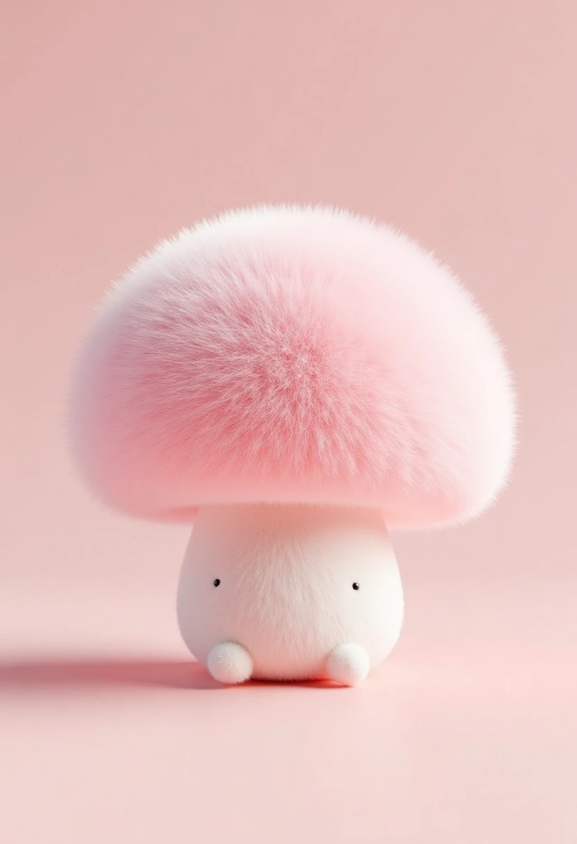 Fluffy texture, plush mushroom figure, pastel color, basic scene, 3D art, mild lighting, cute form.