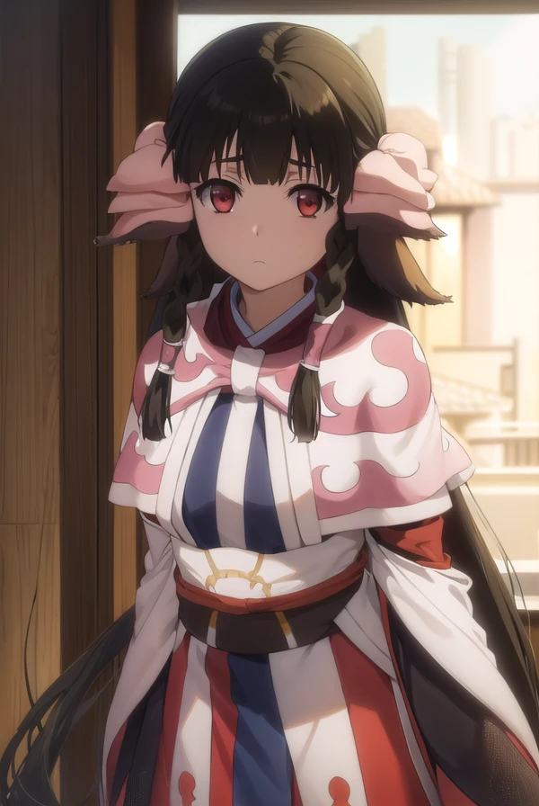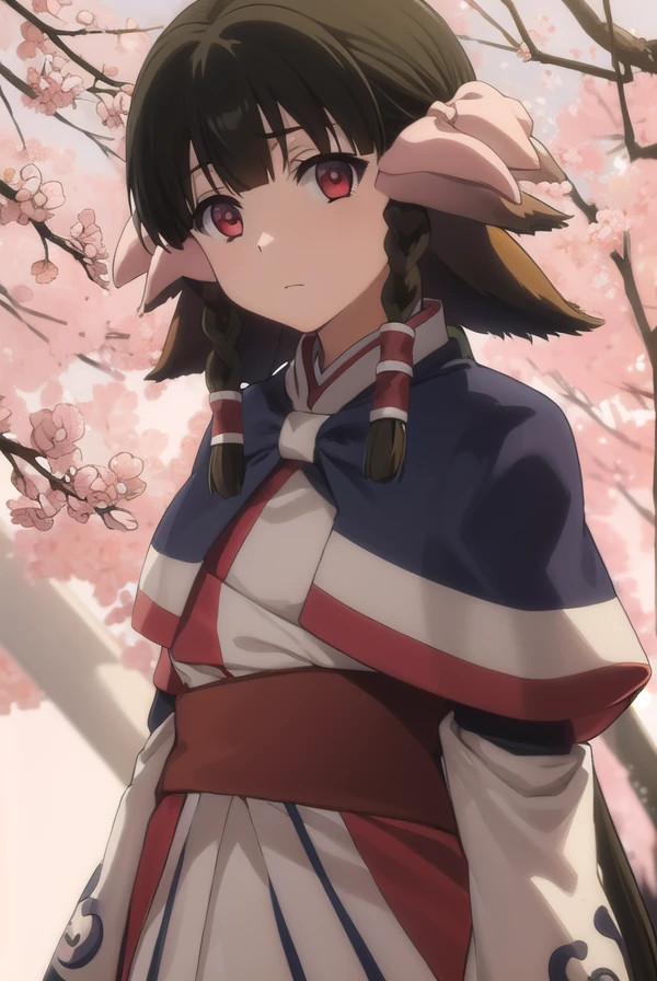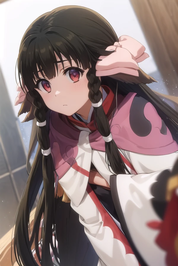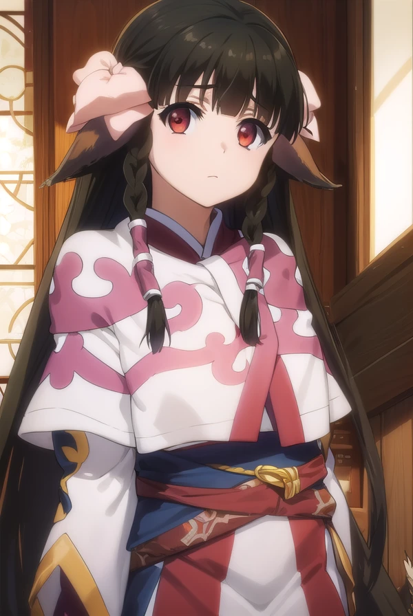 rurutie, long hair, bangs, black hair, animal ears, sidelocks, hair tubes, (red eyes:1.3), bow, hair bow, braid, twin braids,