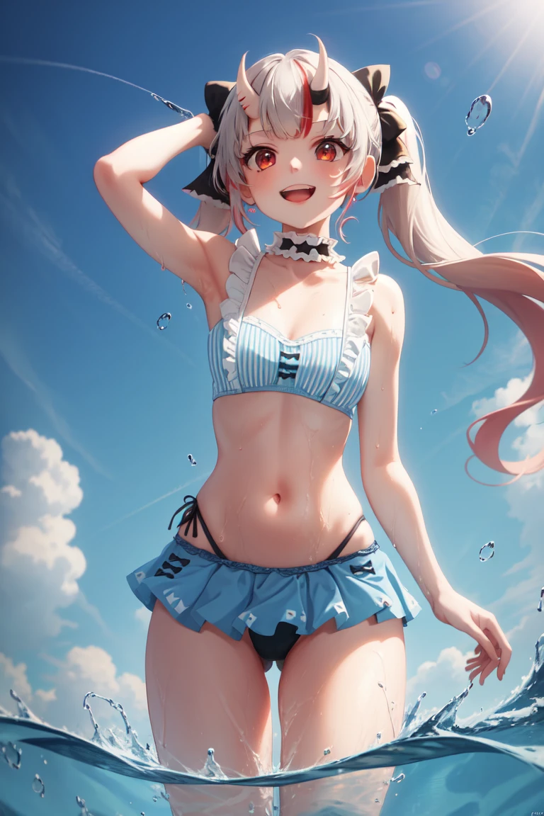 "Nakiri Ayame, long hair, twintails, AyameBikini, blue bikini, frilled bikini, bikini skirt, hair bow, black bow, frilled choker"