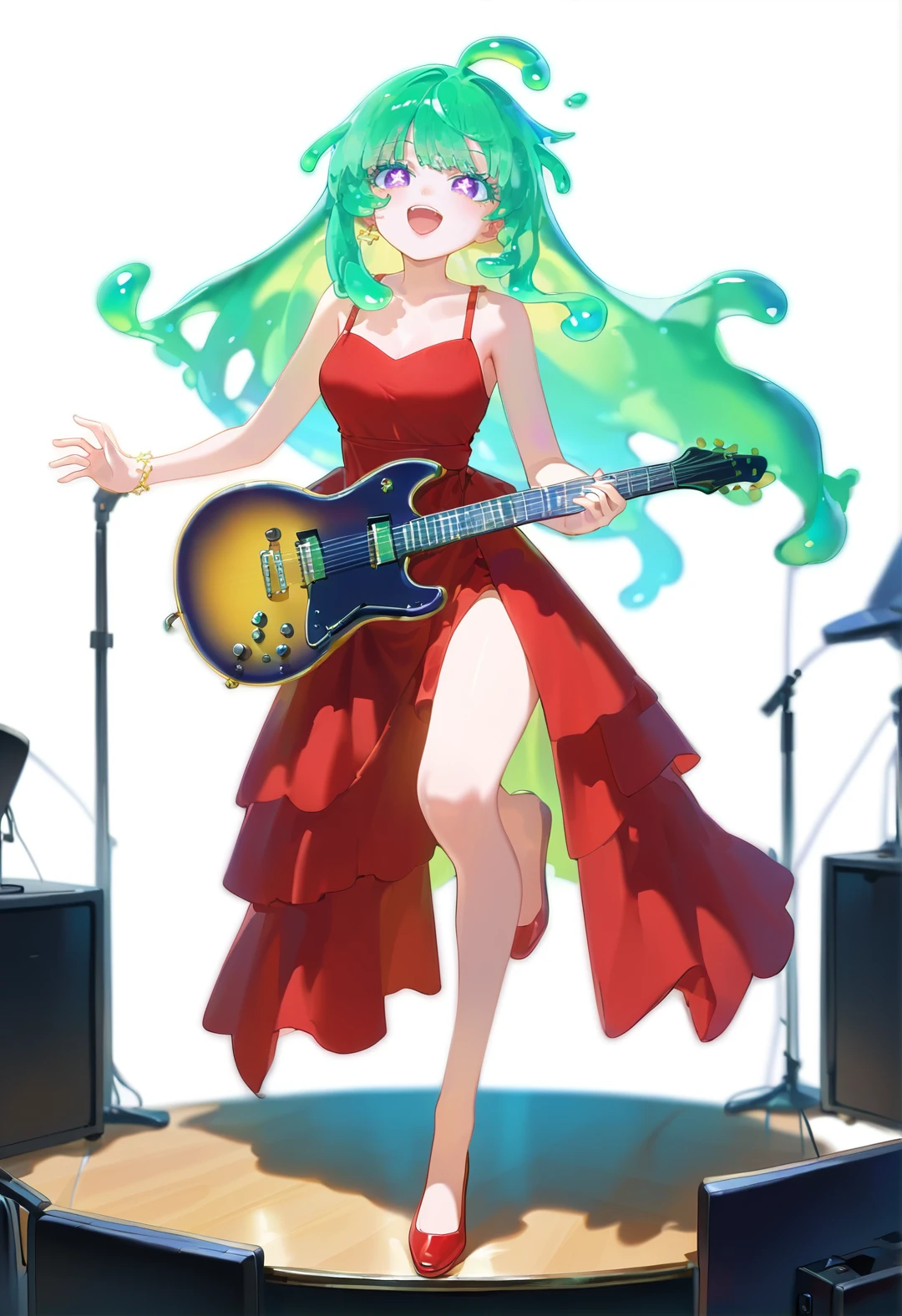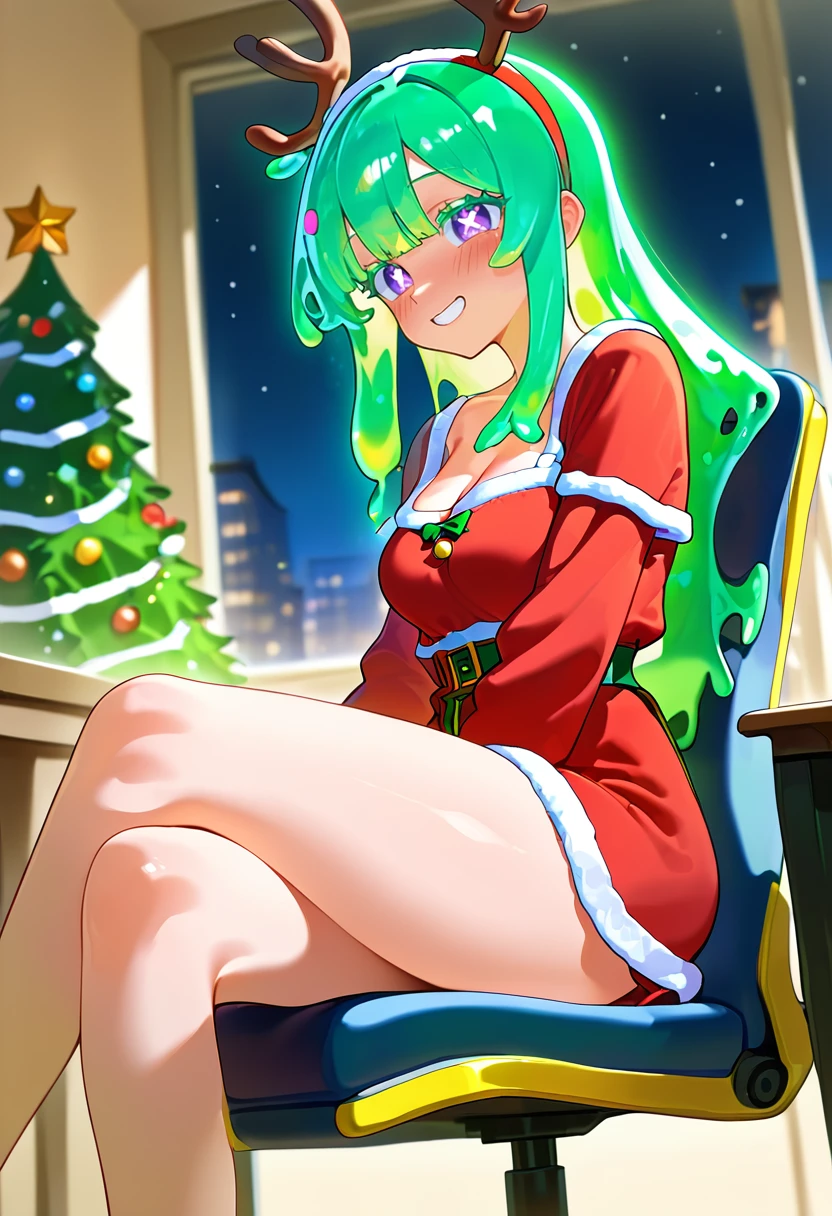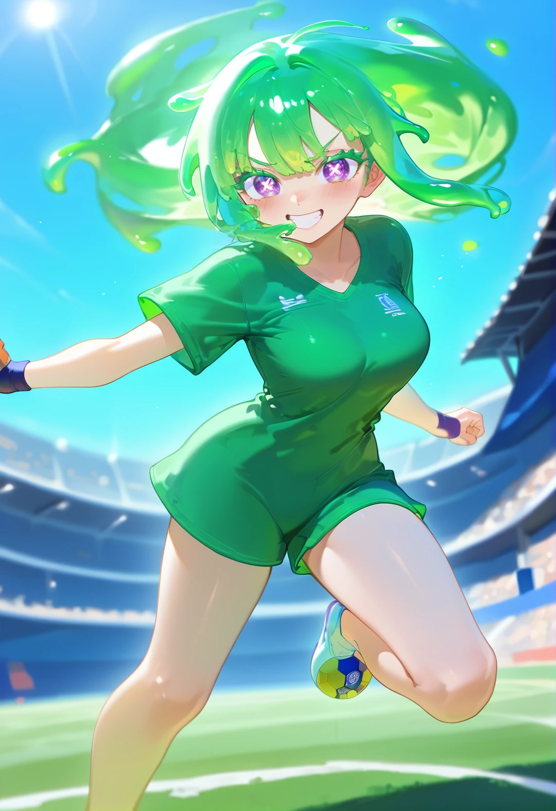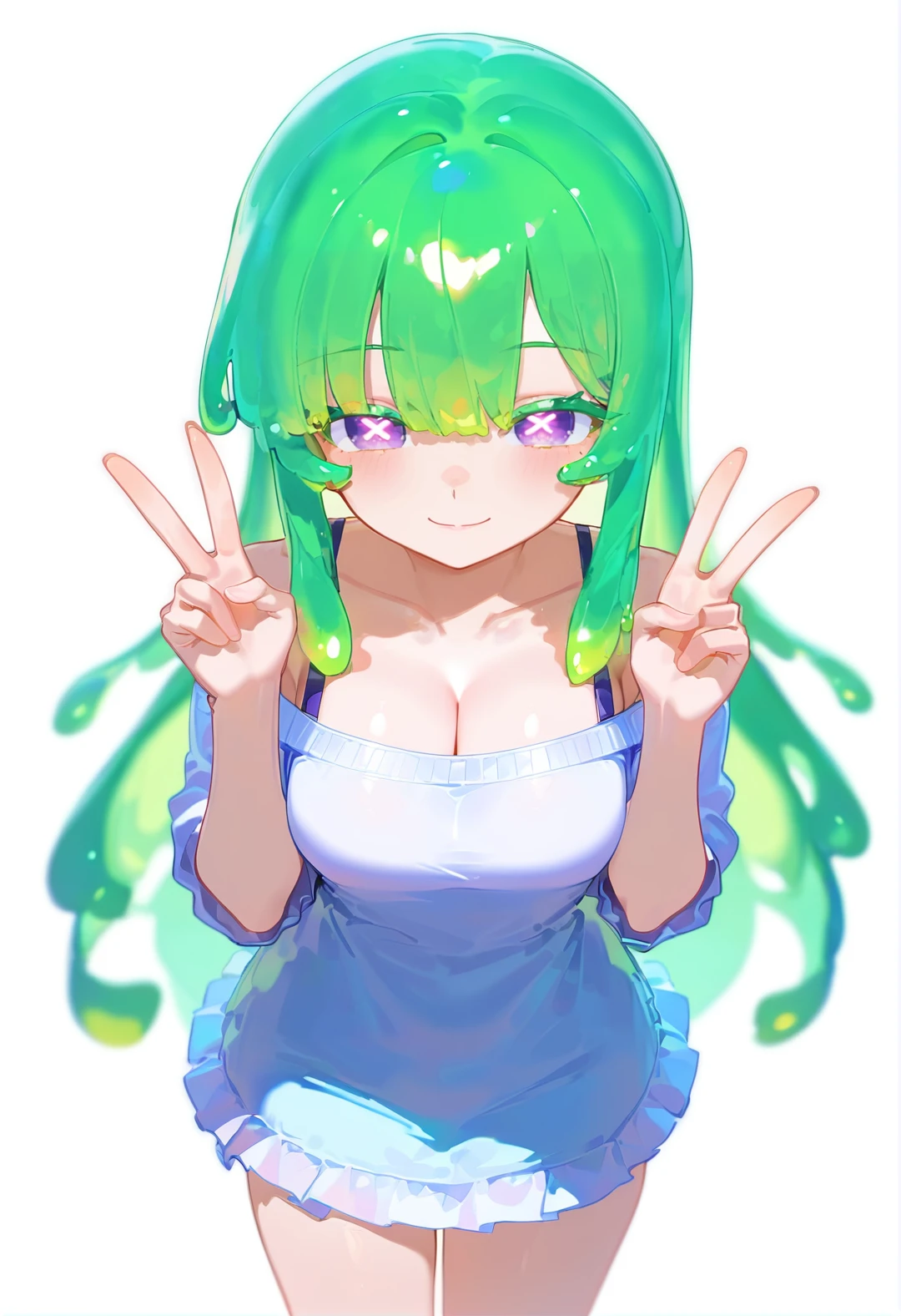 Neneya Green, green hair, purple eyes, x-shaped pupils