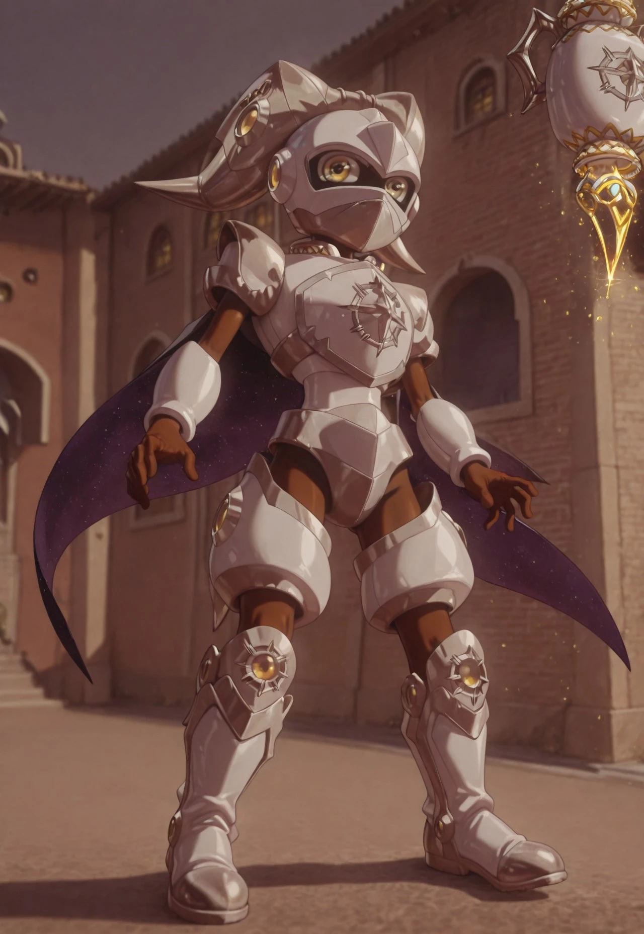 Tags: constellarsiat, solo, full body, no humans, 1boy, dark skin, helmet, yellow eyes, armor, vambraces, boots, cape, vase
