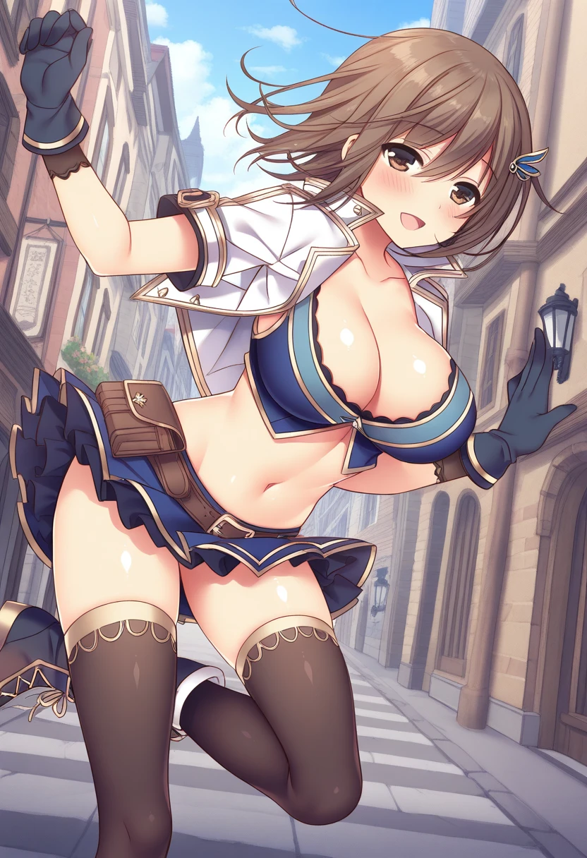 hair ornament, cleavage, blue crop top, midriff, white jacket, blue skirt, black gloves, black thighhighs, cross-laced footwear