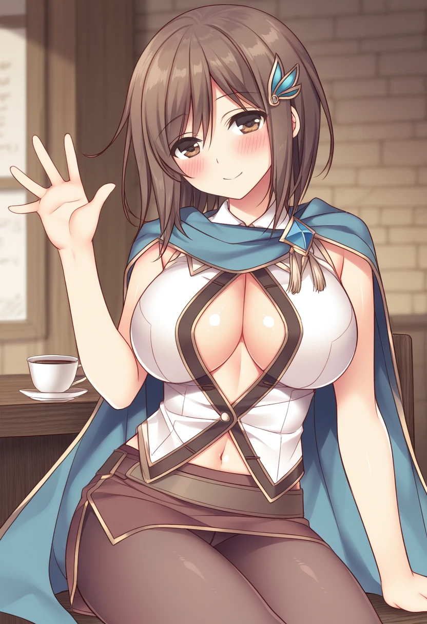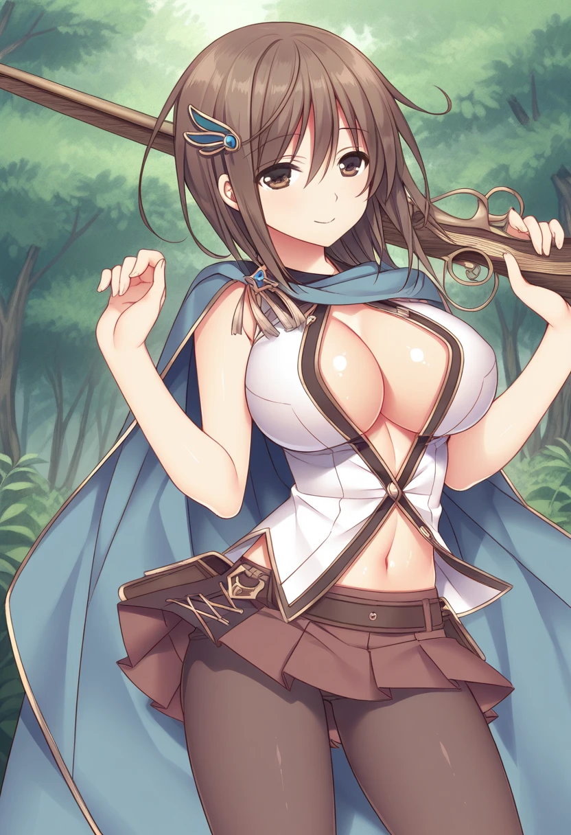 hair ornament, sleeveless shirt, white shirt, cleavage, center opening, navel, blue cape, miniskirt, brown skirt, pantyhose
