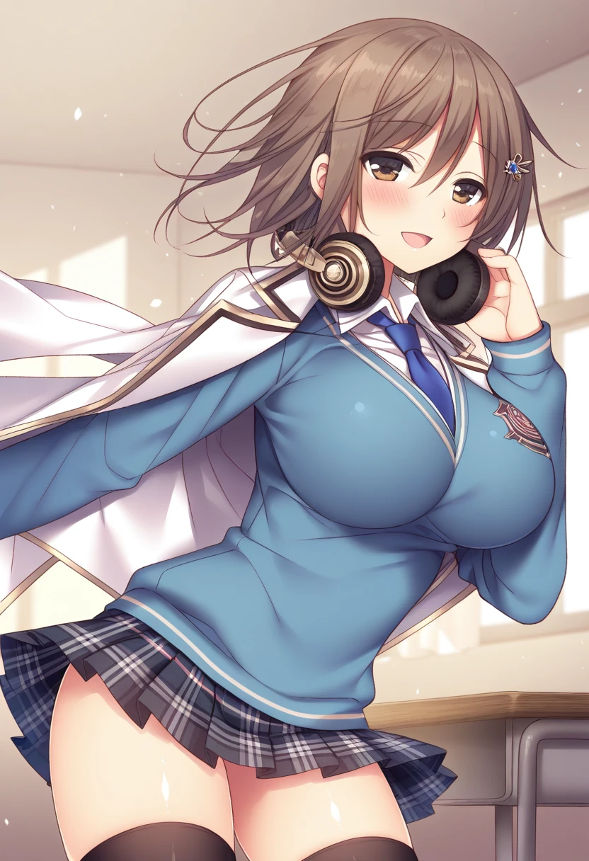 hair ornament, blue necktie, blue sweater, plaid skirt, school uniform, jacket on shoulders, headphones around neck, black thighhighs