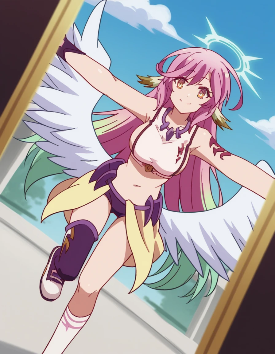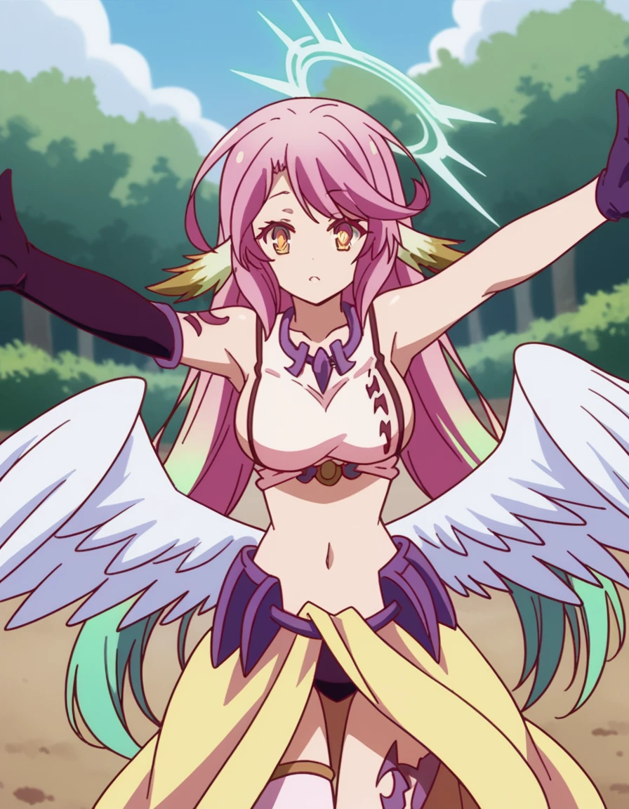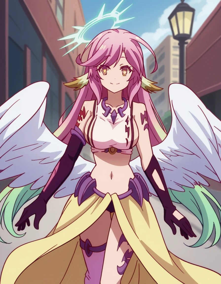 jibril, angel, angel wings, animal ears, bird ears, compass rose halo, feathered wings, feathers, gradient hair, halo, long hair, low wings, multicolored hair, navel, pink hair, symbol-shaped pupils, tattoo, white wings, wing ears, wings, yellow eyes,