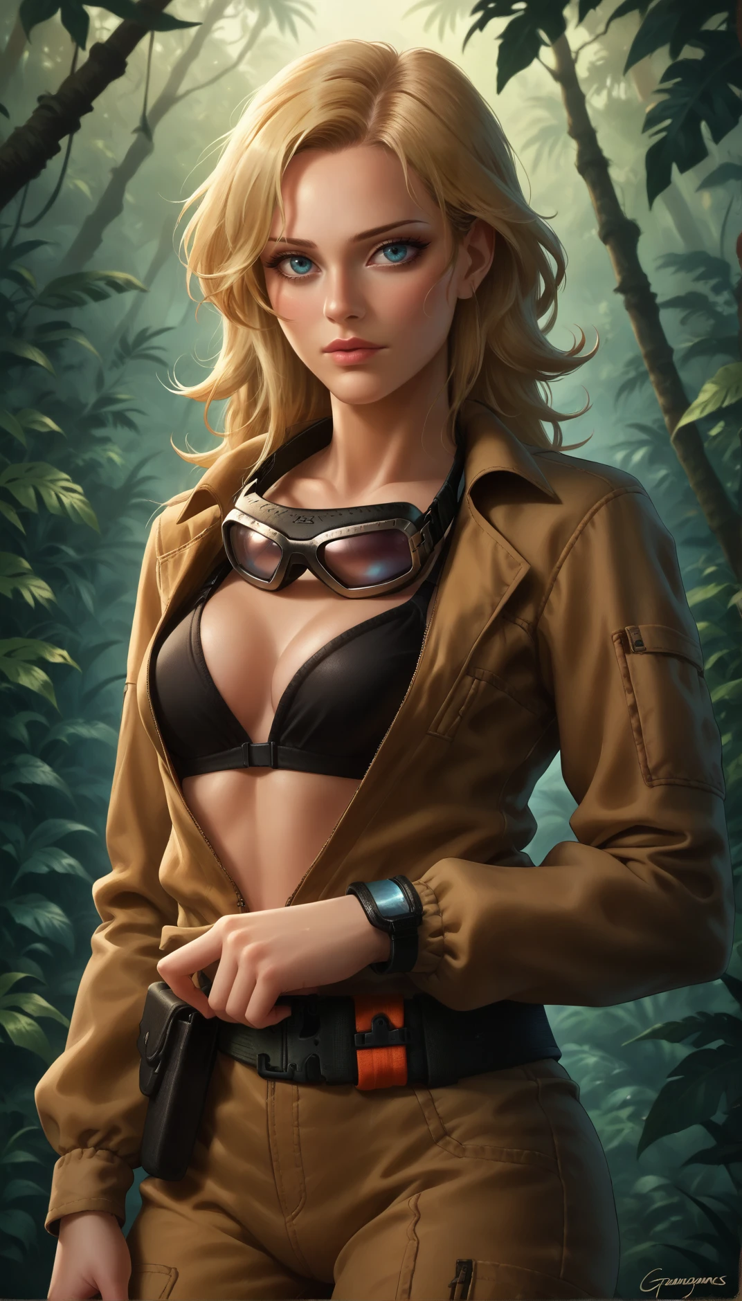 3vamgs3, 1girl, blonde hair, jumpsuit, goggles around neck