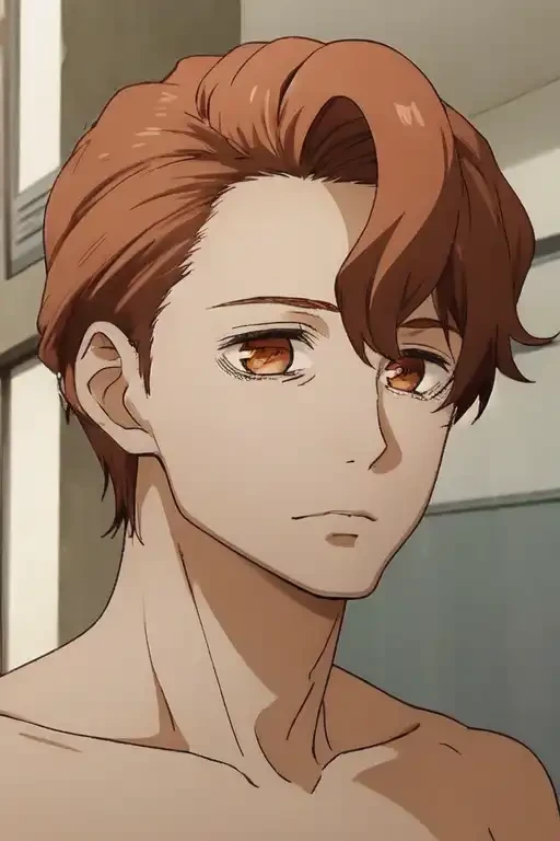 1boy, feldspar hair, short cropped tousled hair, left side bangs, tired orange eyes,