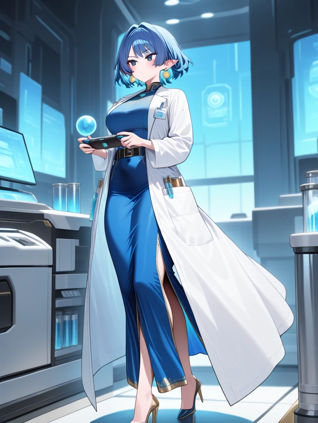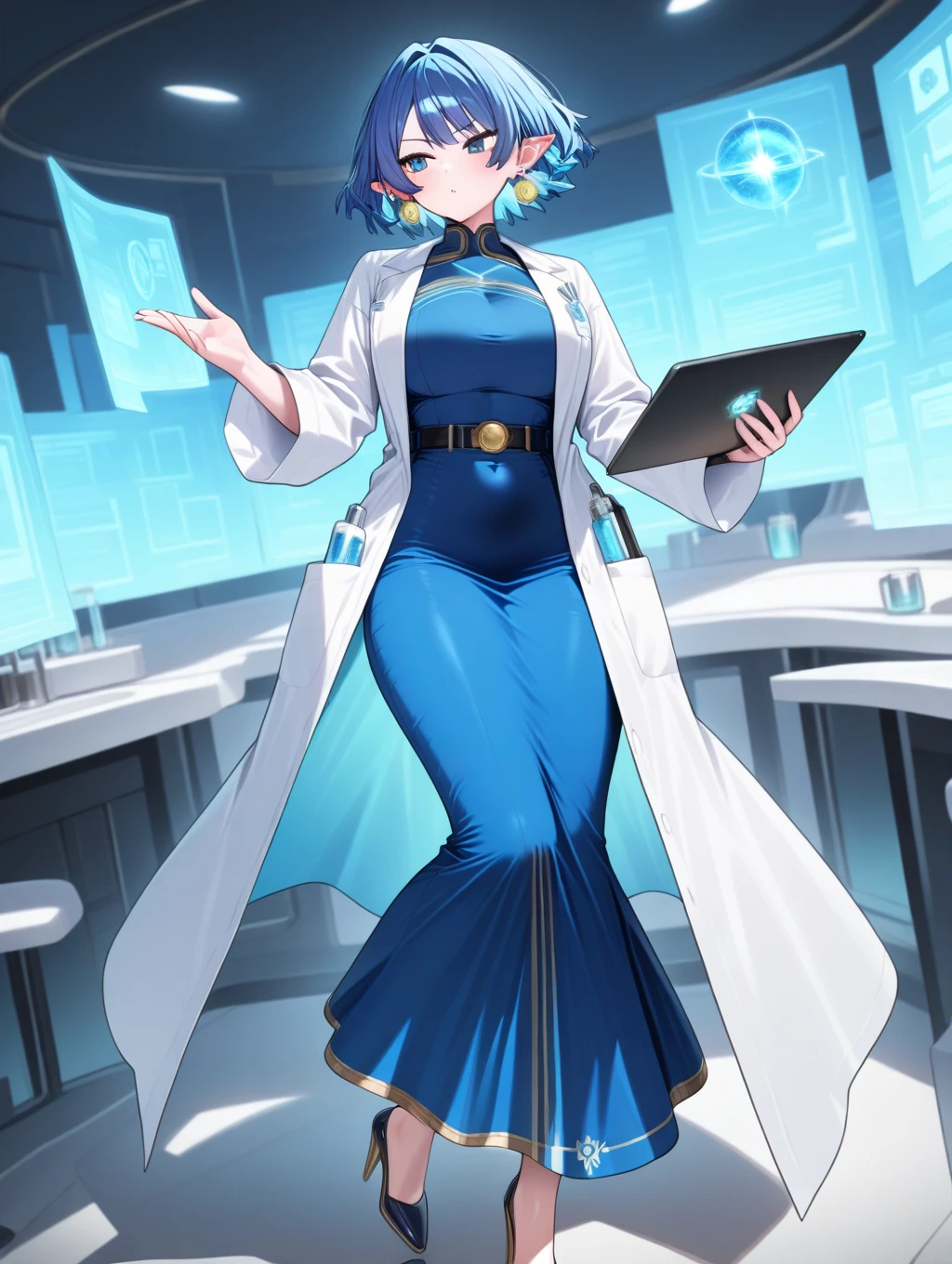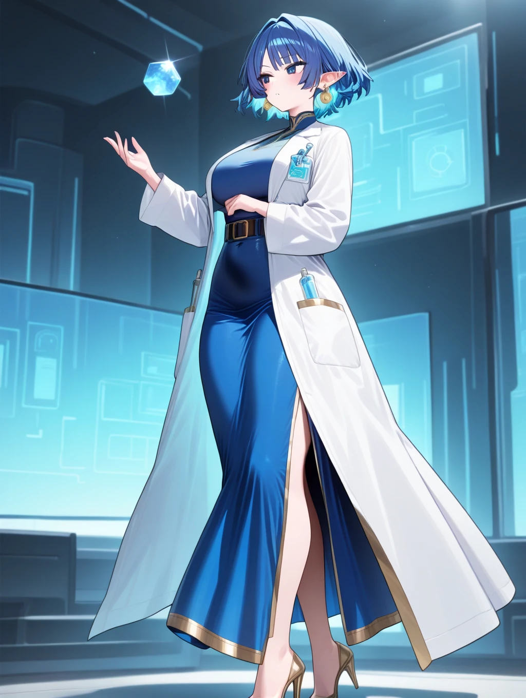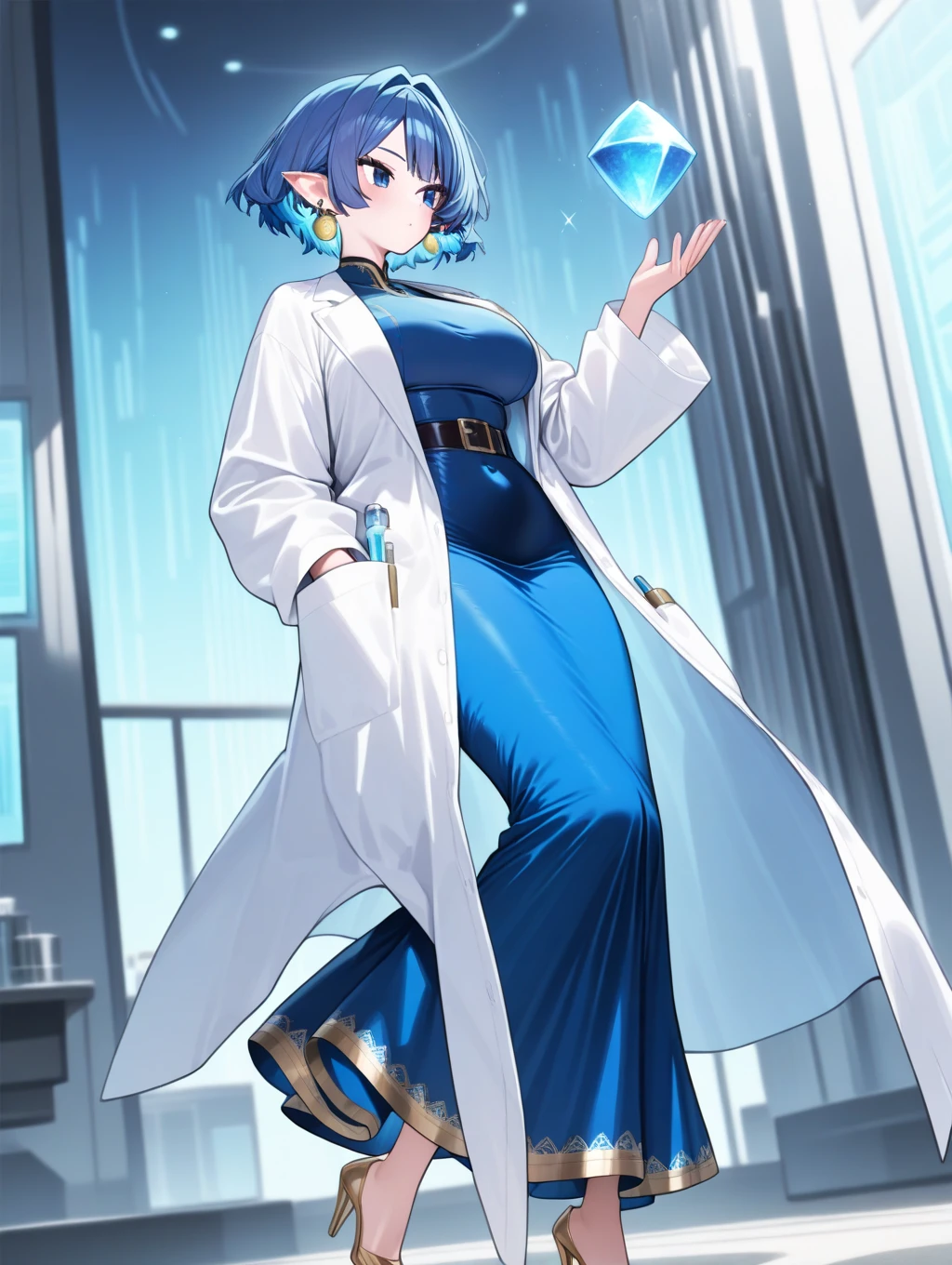 prompt example :rima,blue hair,blue eyes,short hair,pointy ears,earrings,blue dress,long dress,lab coat,belt,gold trim,high heels,