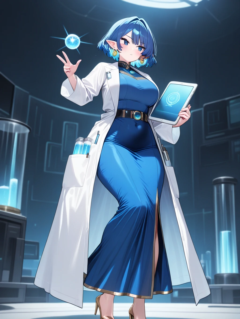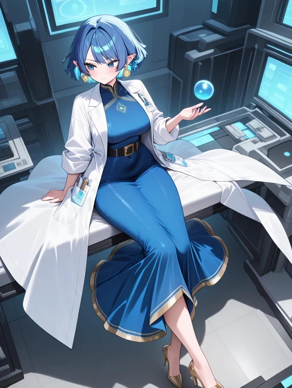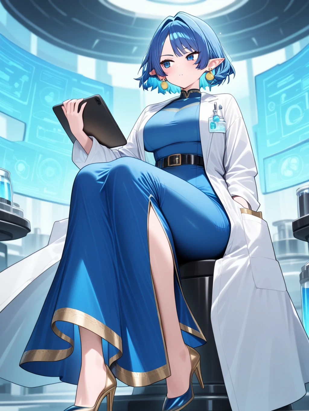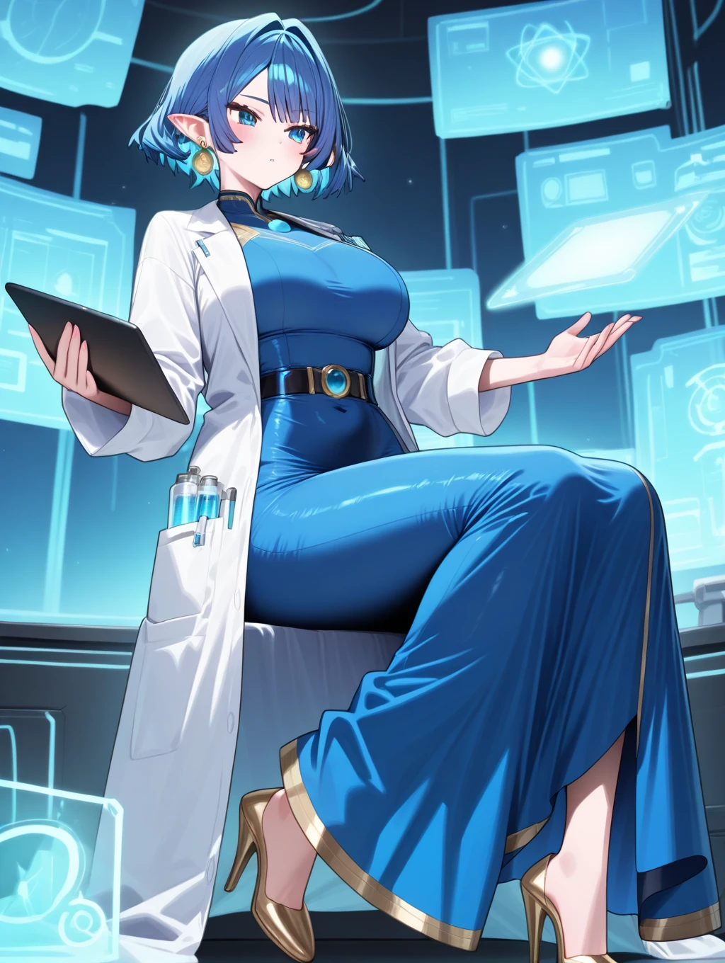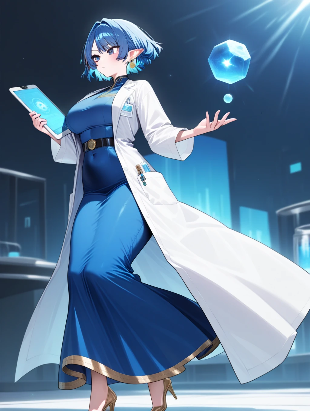 prompt example :rima,blue hair,blue eyes,short hair,pointy ears,earrings,blue dress,long dress,lab coat,belt,gold trim,high heels,