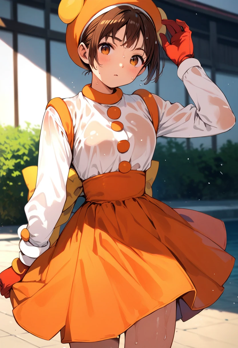 <lora:hananokouji kurara-000003:1.0>, hananokouji kurara, brown hair, bangs, hat, brown eyes, gloves, skirt, white shirt, long sleeves, orange skirt, red gloves, yellow ribbon on back,