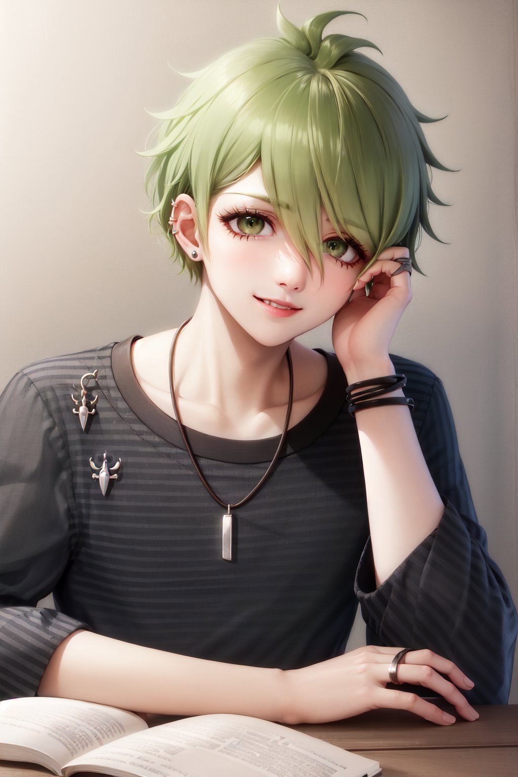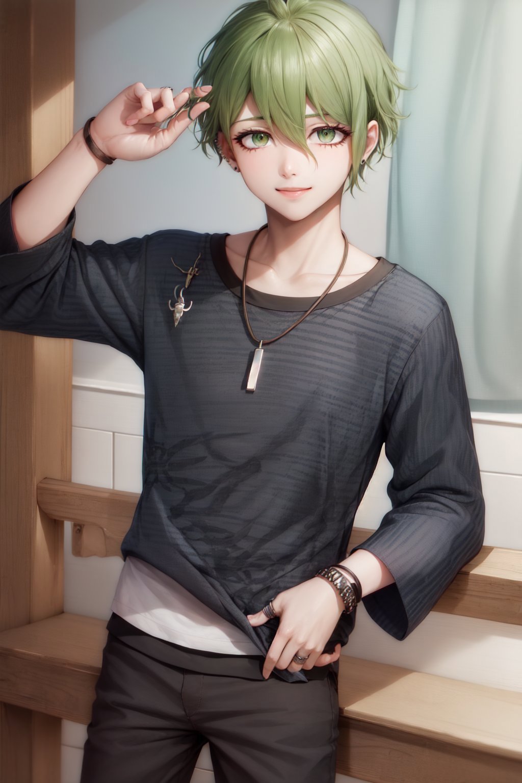 Default Outfit: striped shirt, long sleeves, pants, jewelry, necklace, earrings, ring, bracelet, ear piercing, collarbone