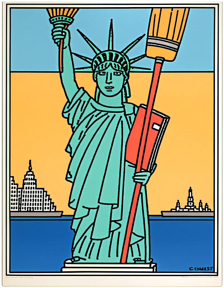 • a drawing of a drawing of a statue of liberty with object on it in the style of seymour-chwast