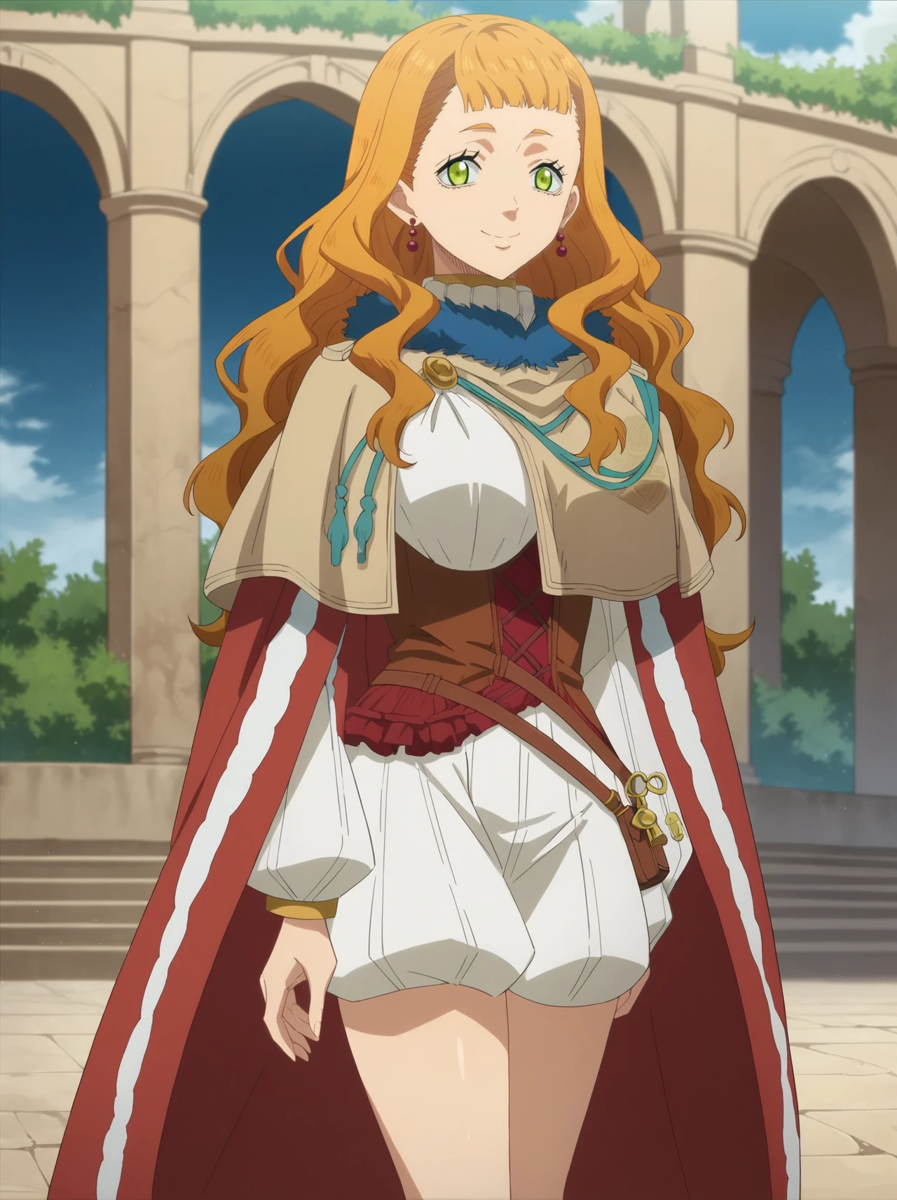 Activation text: mimosa_v, long hair, orange hair, green eyes, jewelry, earrings, wavy hair, cape