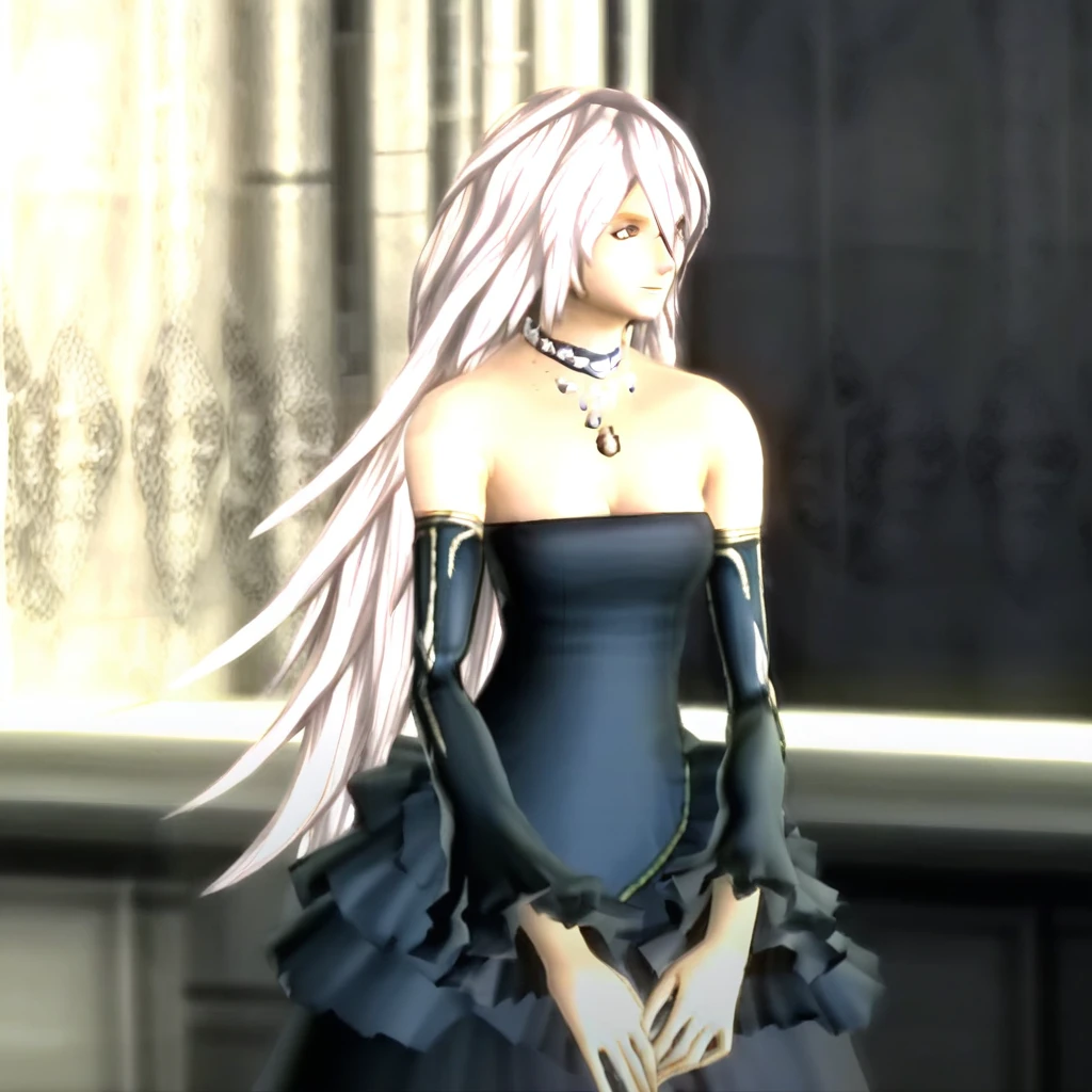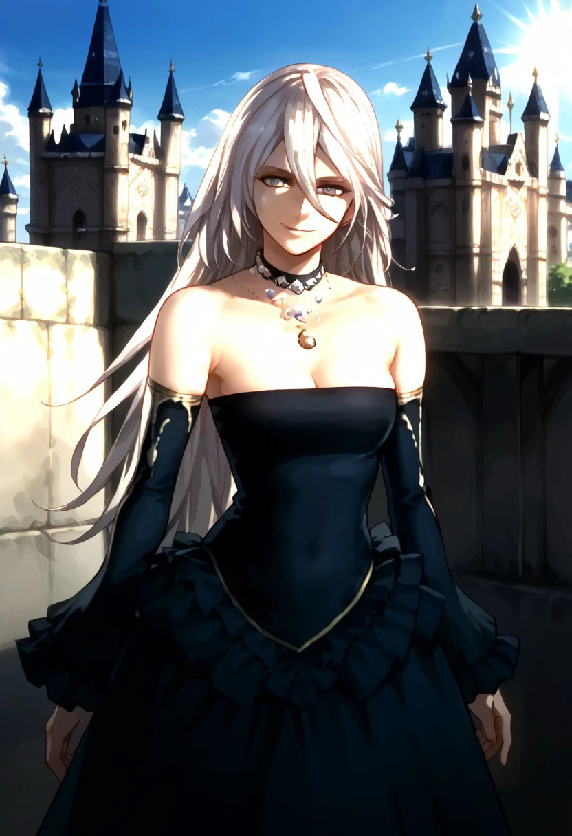 gowncalista,1girl ,solo, long hair,bare shoulders, choker, jewelry, necklace, black dress, breasts, white hair, detached sleeves, elbow gloves, gloves, cleavage, gown, black gown,