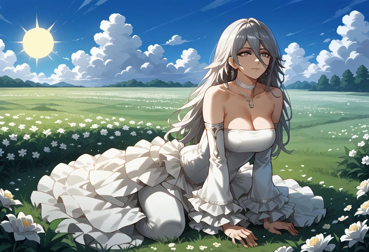 1girl, solo, breasts ,cleavage, bare shoulders, choker, detached sleeves, jewelry, grey eyes, long hair, large breasts, necklace, strapless, weddingcalista, wedding dress,