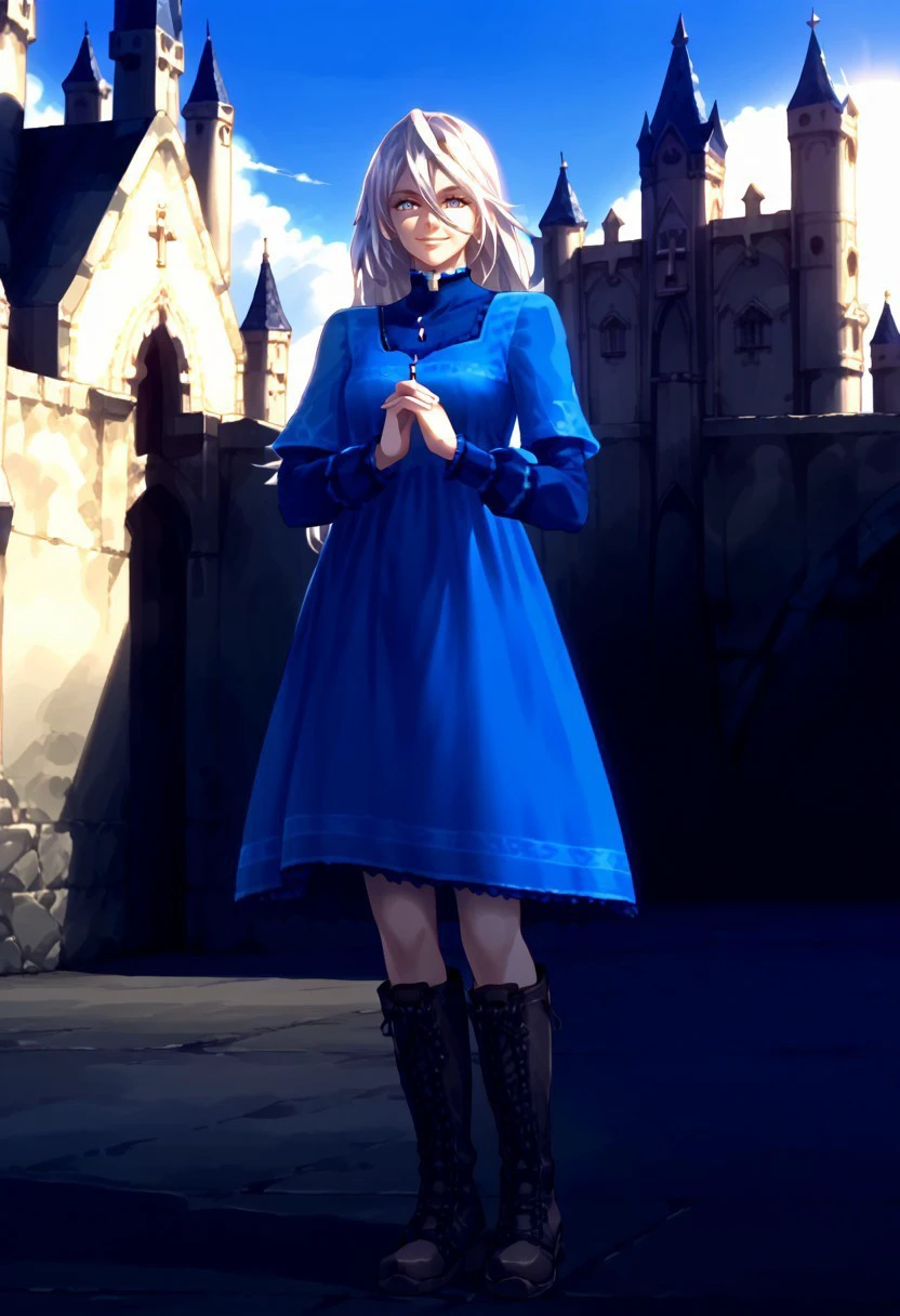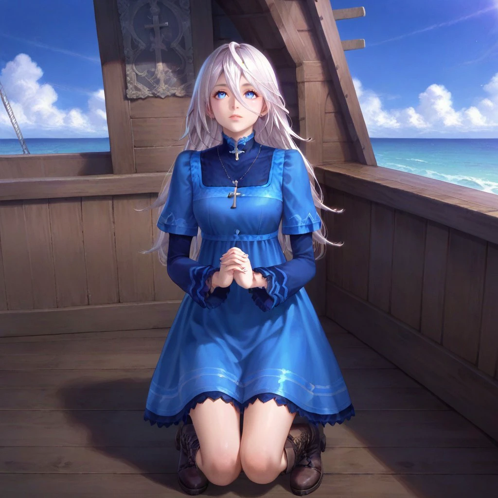 calista,1girl, solo, boots, long hair, knee boots, blue dress, cross-laced footwear, necklace, smile,praying,jewelry,