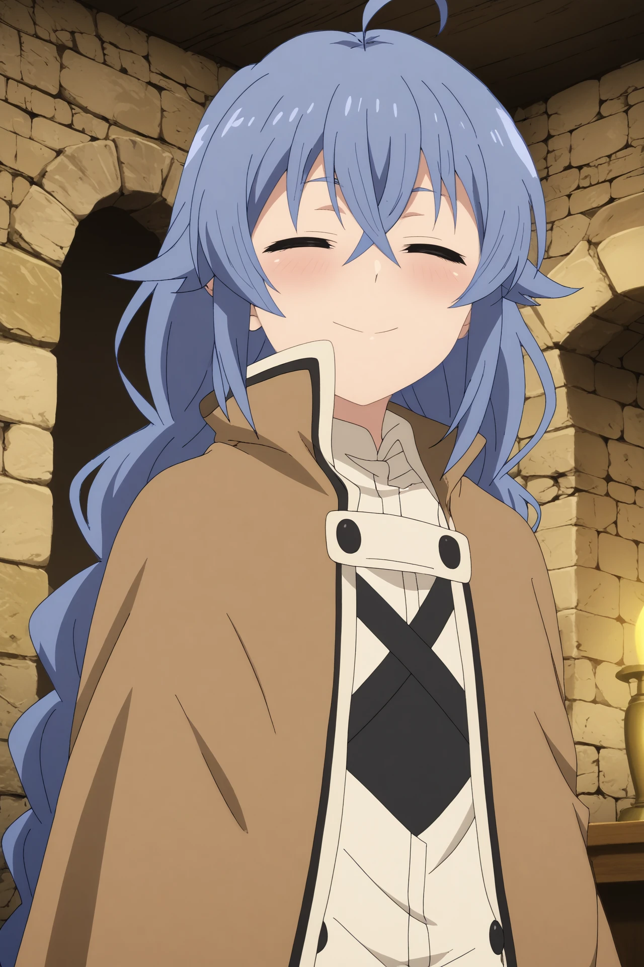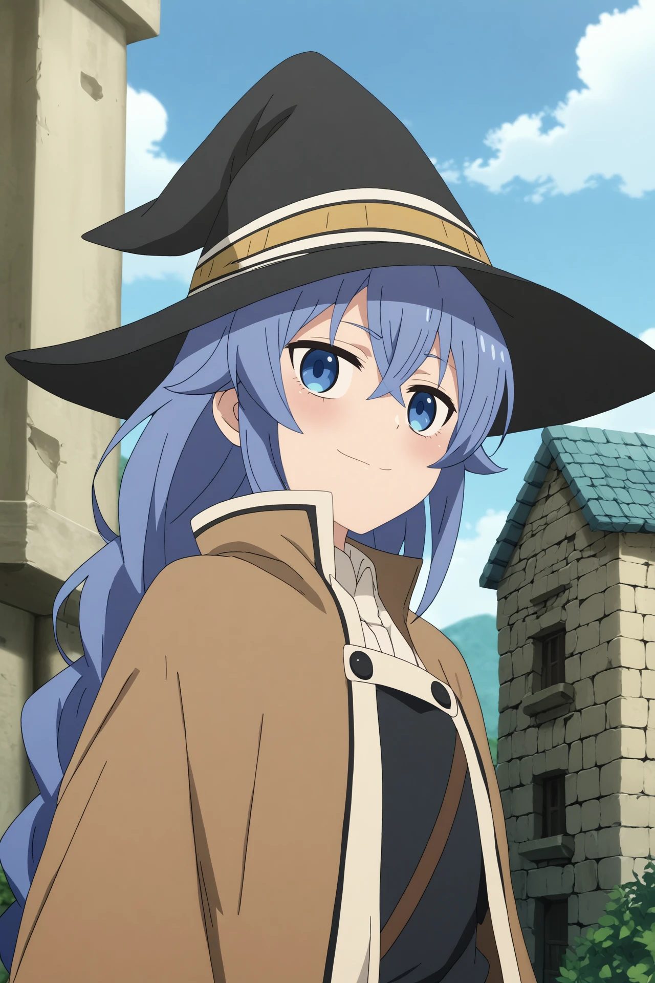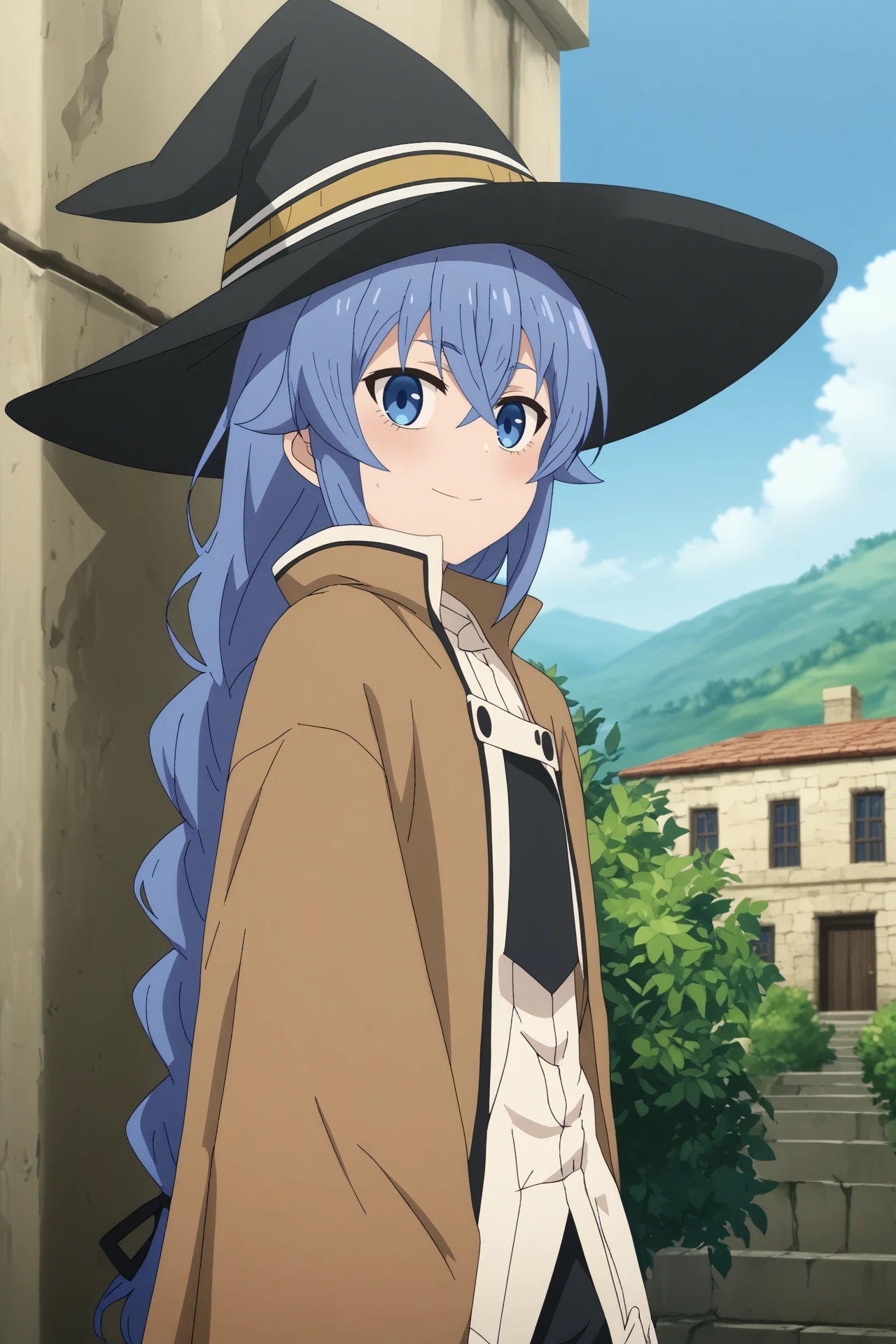 roxy migurdia,1girl,solo,looking_at_viewer,braid,long hair,bangs,twin braids,ahoge,hair between eyes,long sleeves,crossed bangs,brown cape,smile,witch hat,hat