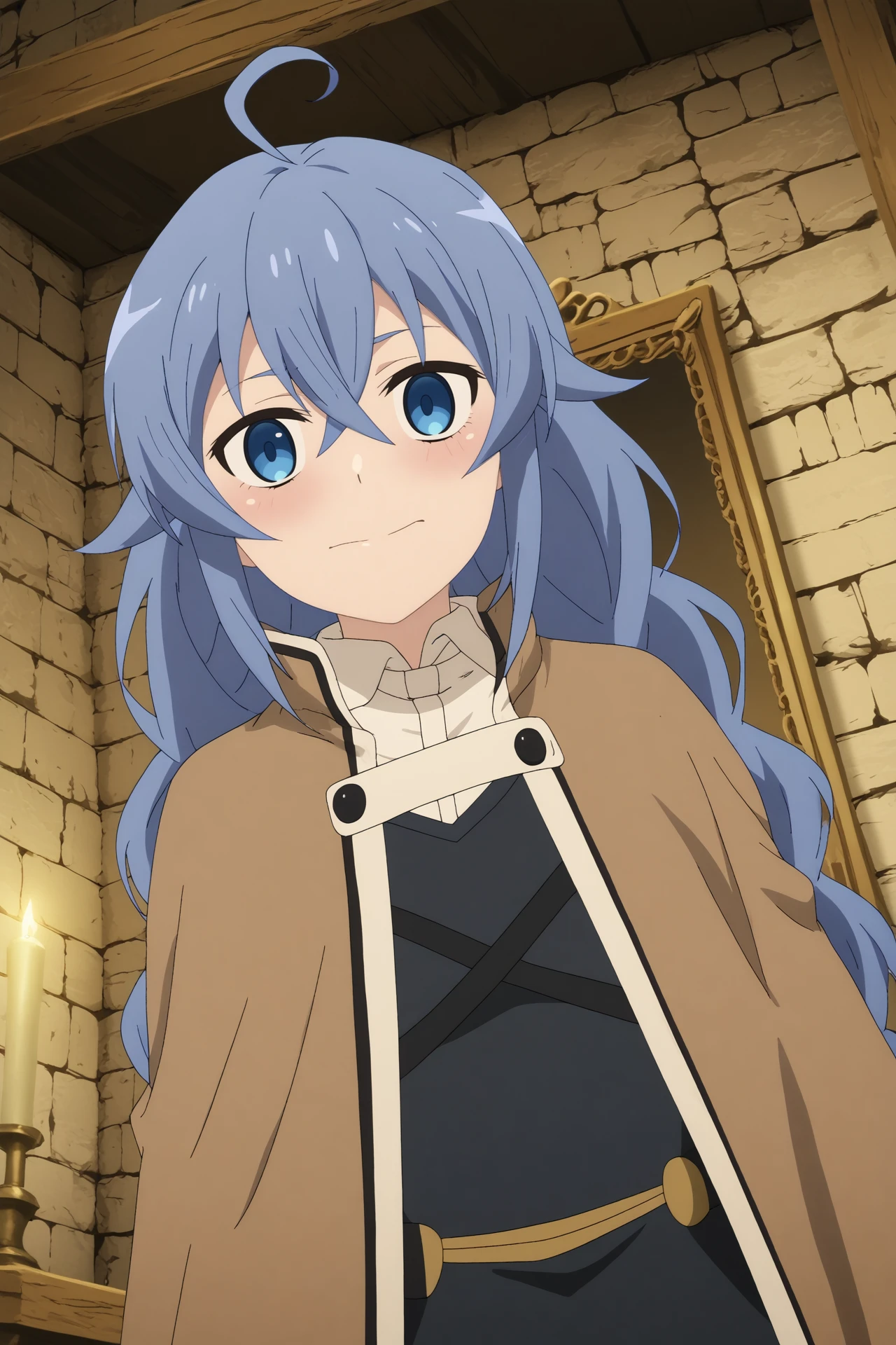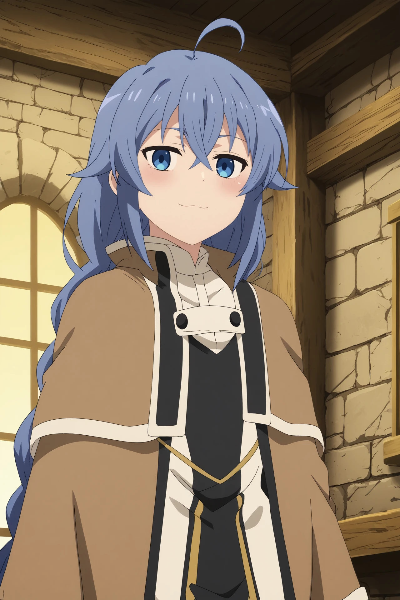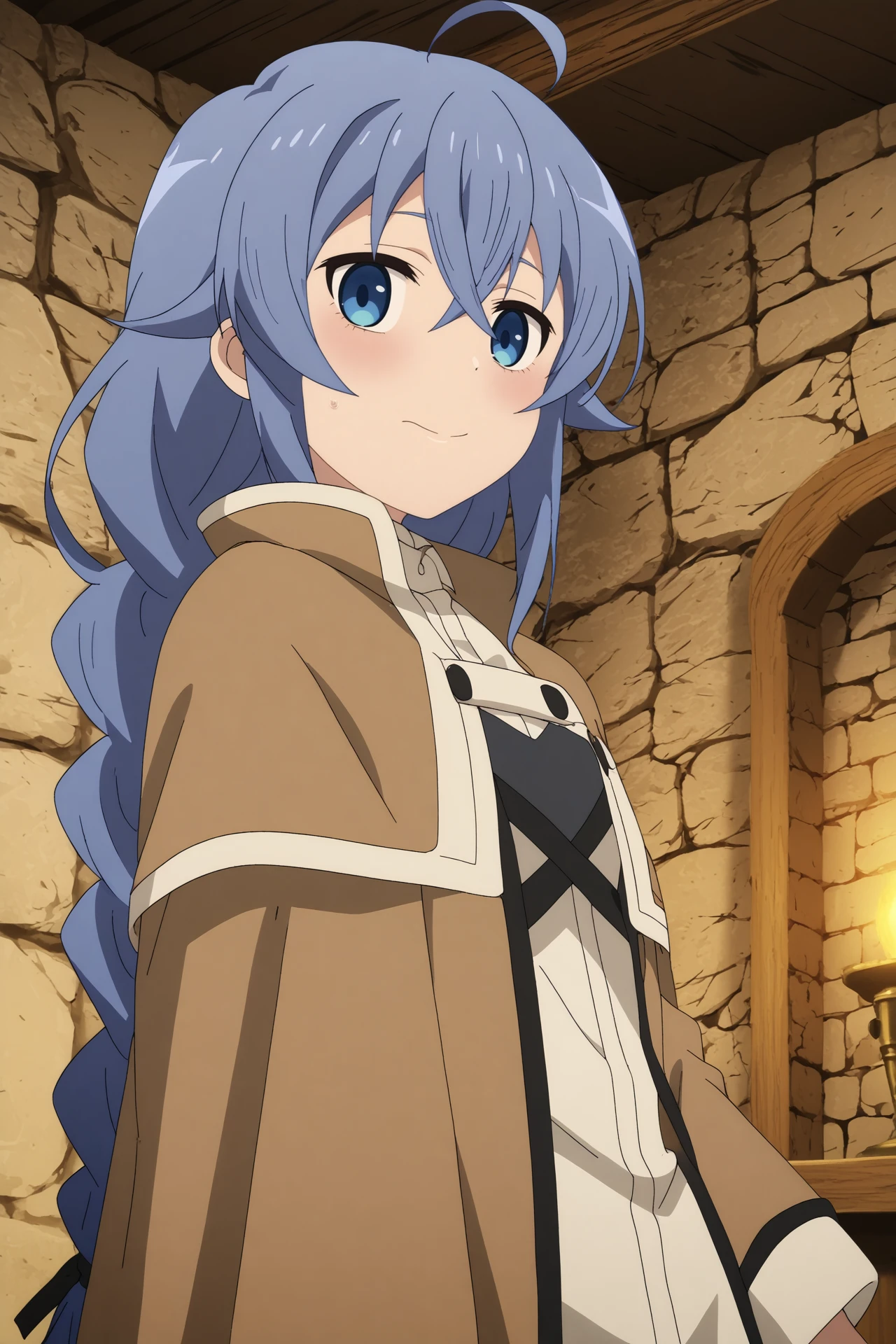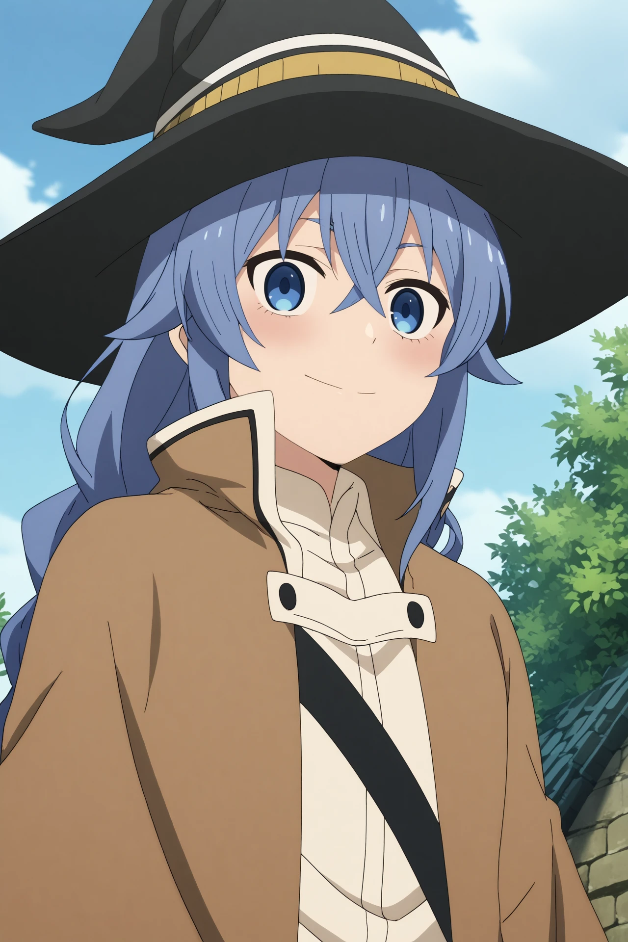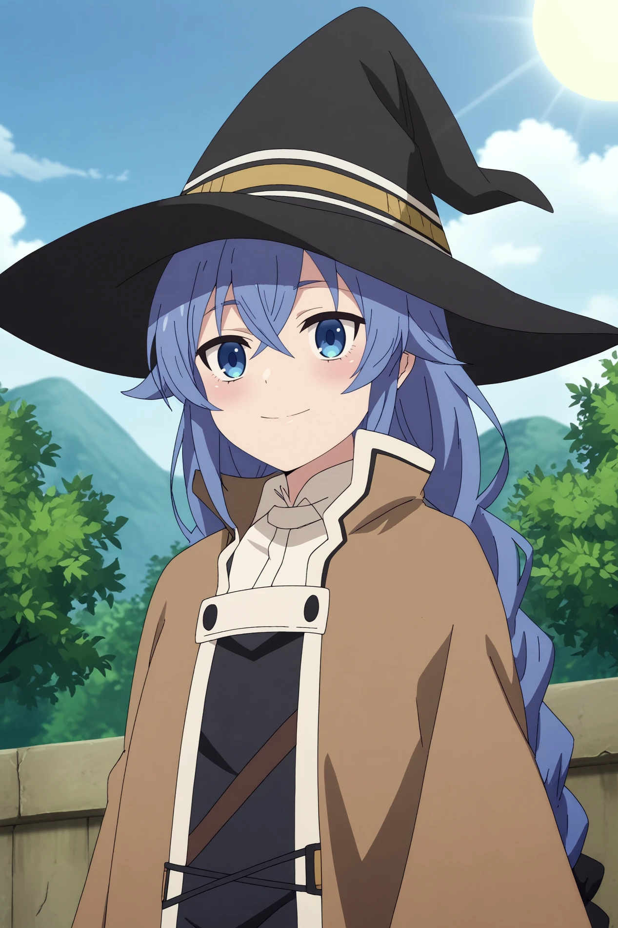 Triggers : roxy migurdia,1girl,solo,looking_at_viewer,braid,long hair,bangs,twin braids,ahoge,hair between eyes,long sleeves,crossed bangs,brown cape,smile,witch hat,hat