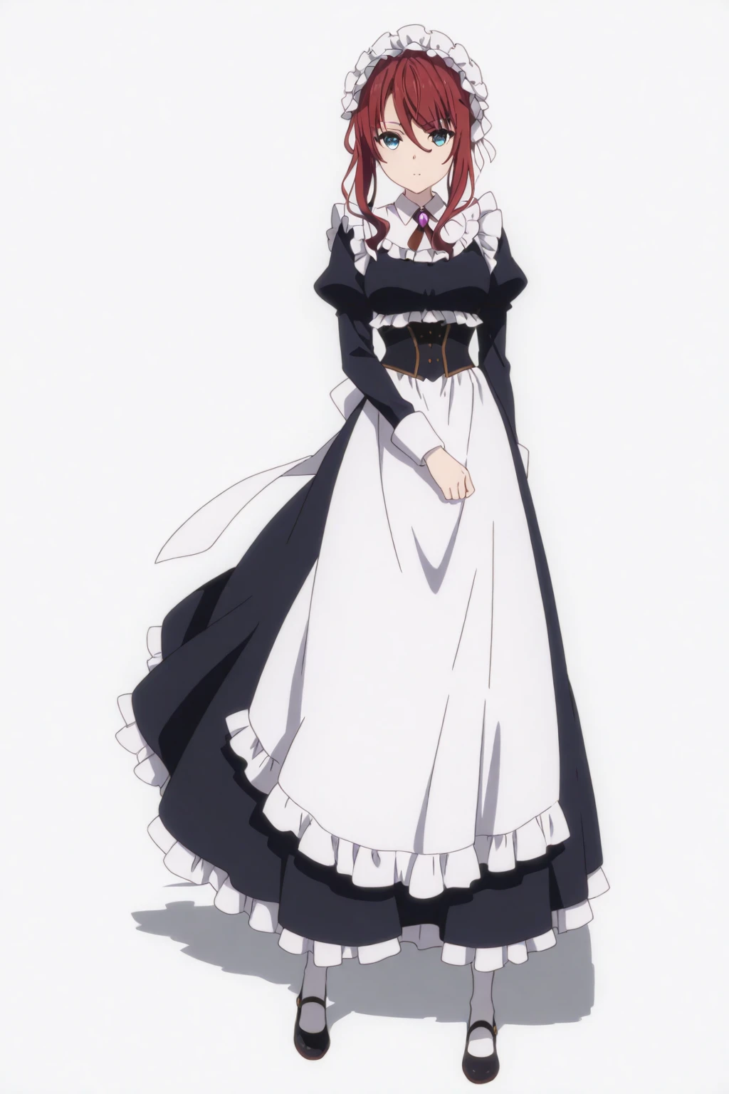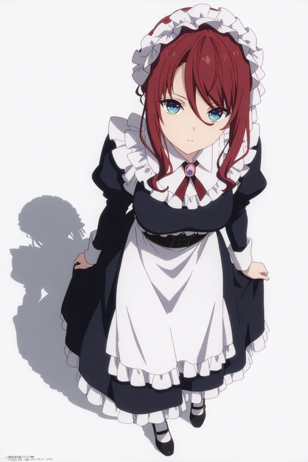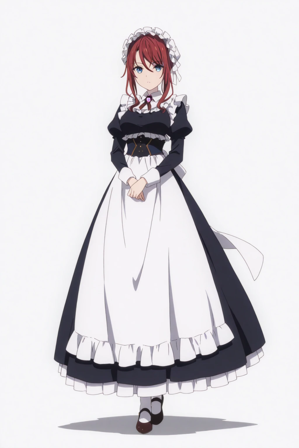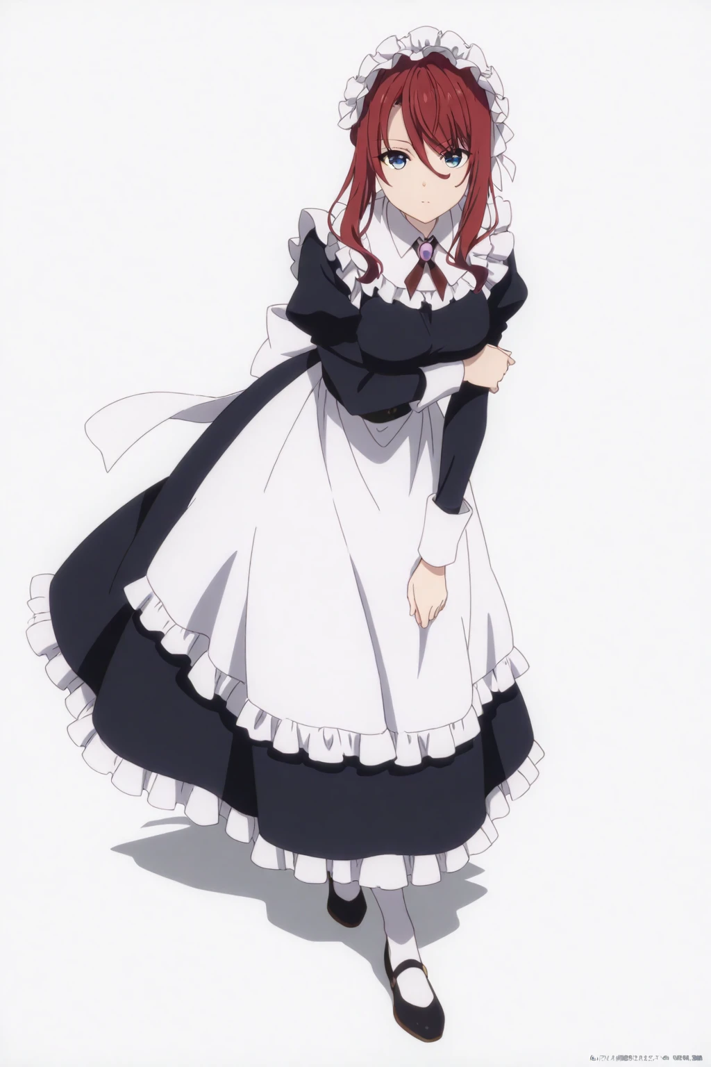 illya_coral, 1girl, solo, maid, blue eyes, apron, red hair, maid headdress, long sleeves, dress, frills, shoes, anime coloring