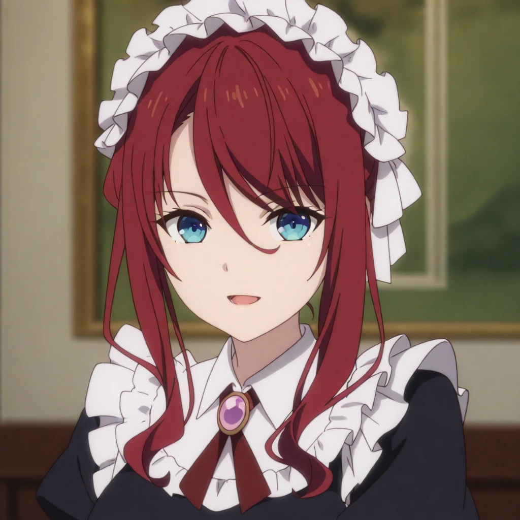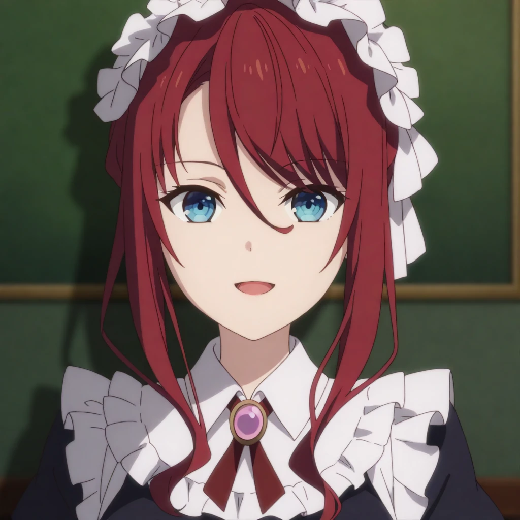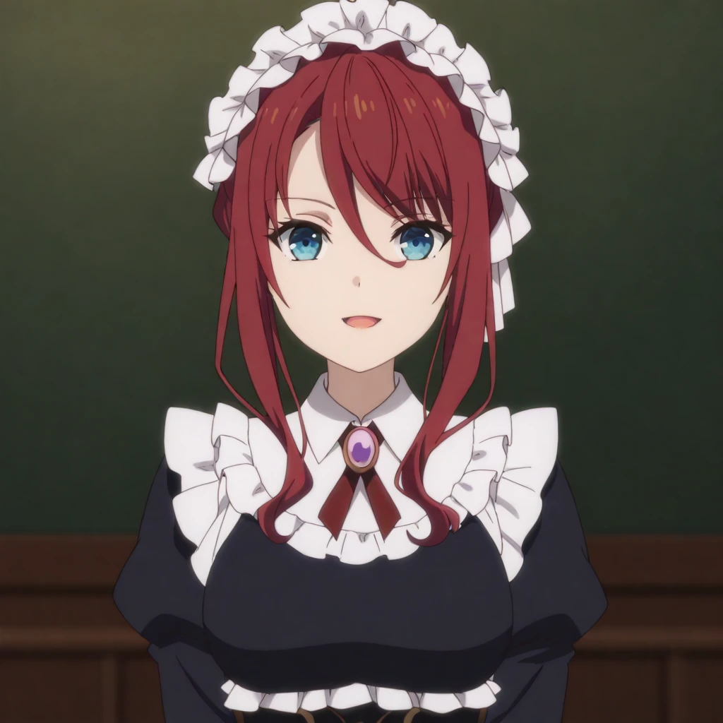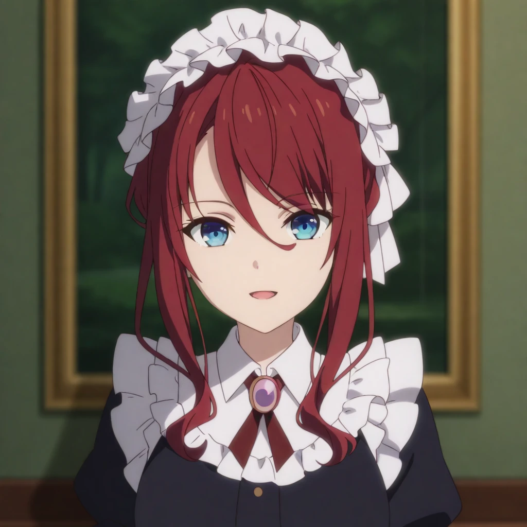illya_coral, 1girl, solo, maid, blue eyes, apron, red hair, maid headdress, long sleeves, dress, frills, shoes, anime coloring