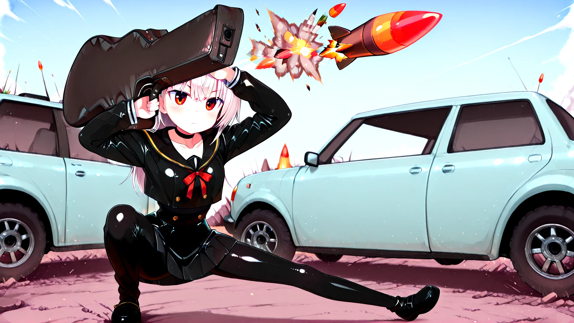 guitar case weapon, firing rocket, crouching pose, guitar case on shoulder, holding guitar case, outstretched leg