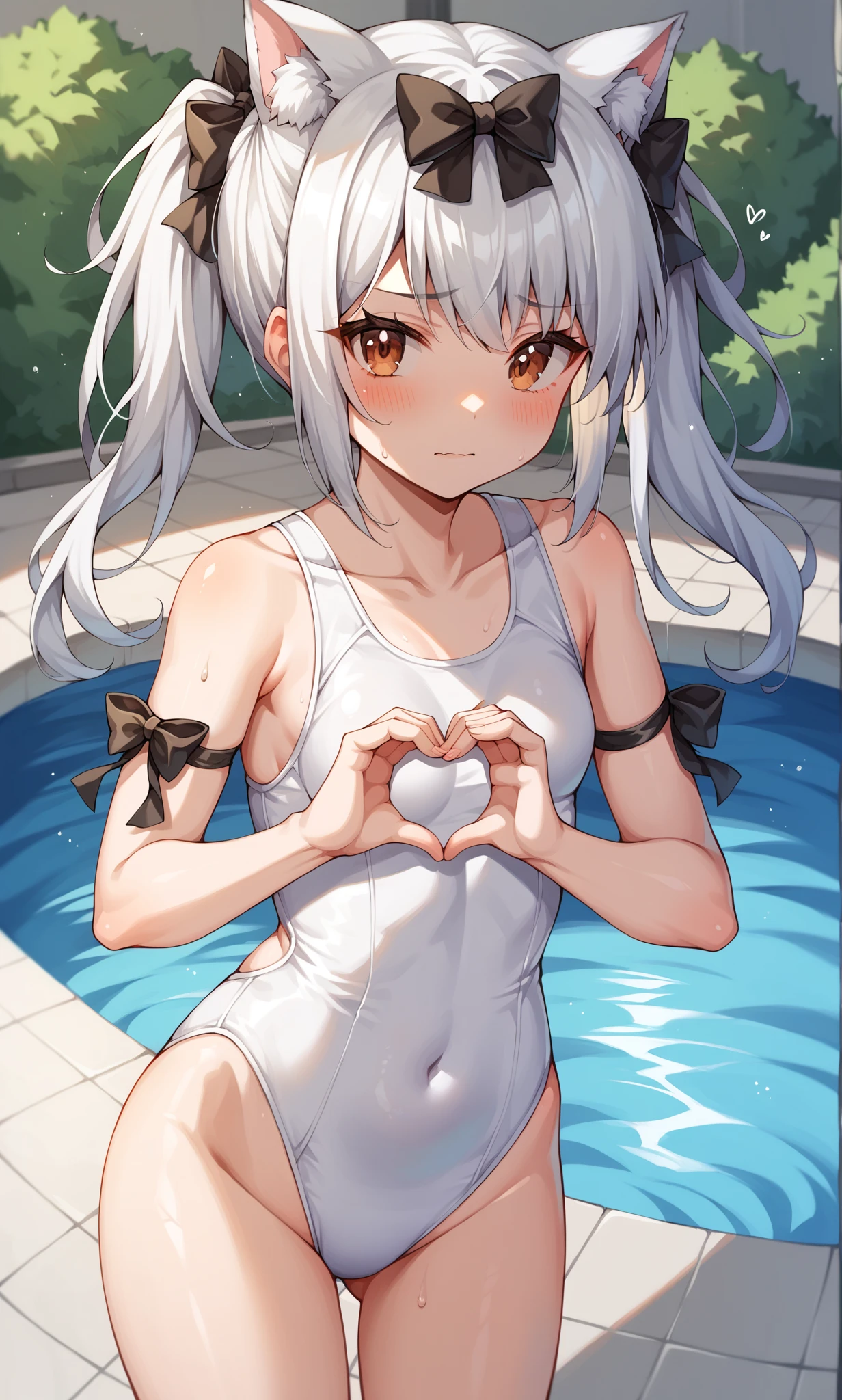 yukikaze, brown eyes, cat ears, white hair, long hair, twintails, black bow, hair bow