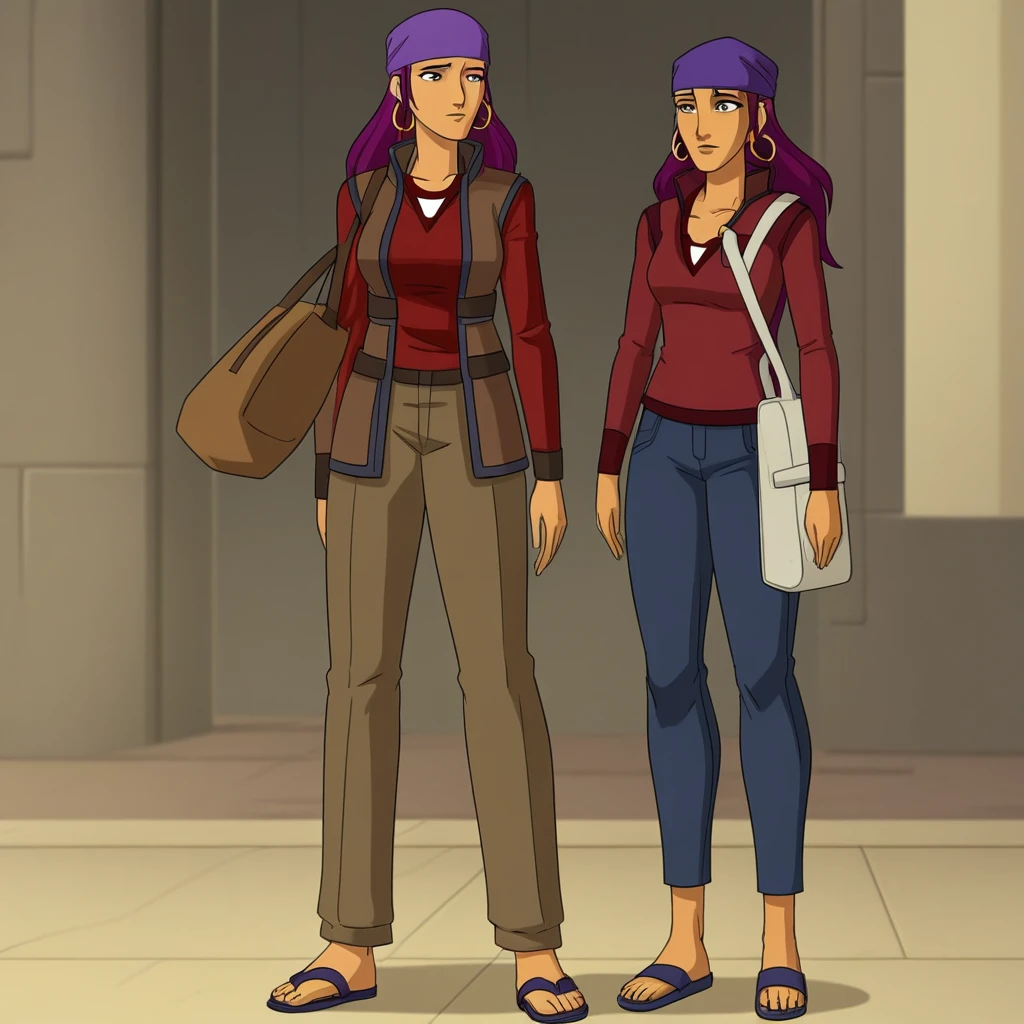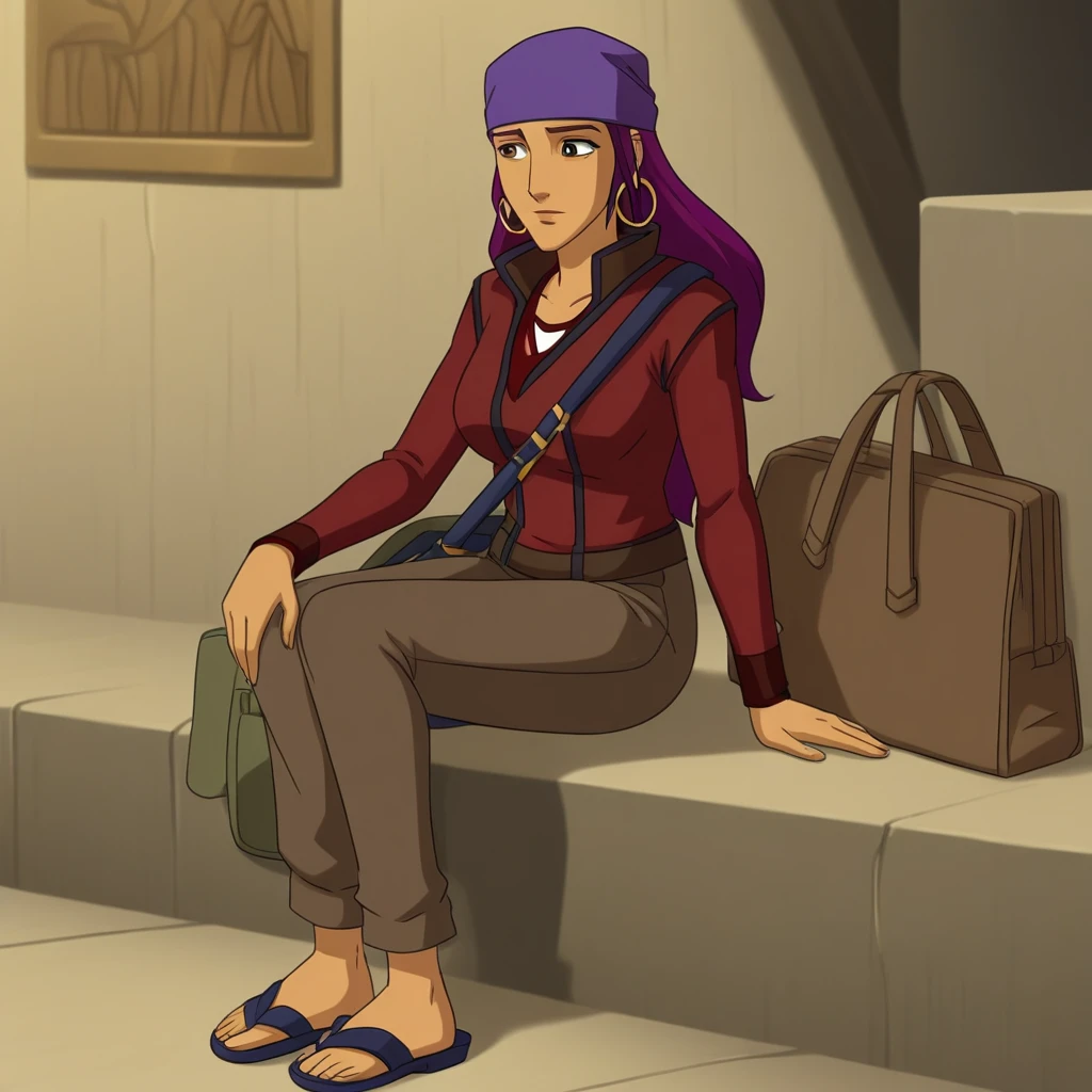 GalactikFootballMaya, 1girl, solo, female focus, brown eyes, jewelry, hoop earrings, purple hair, long hair, bandana, hat, dark skin, dark-skinned female, red shirt, long sleeves, pants, sandals