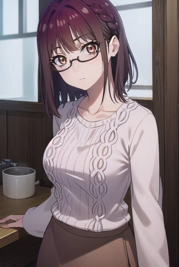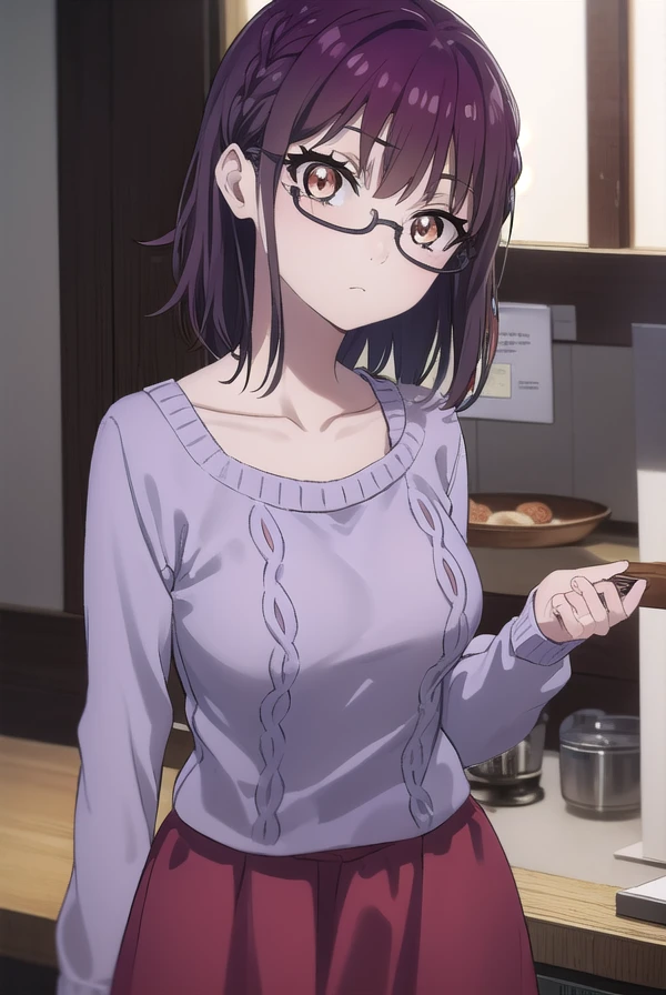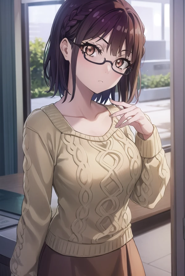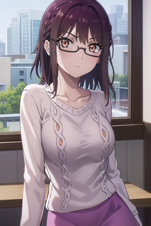 sumika fujimiya, (brown eyes:1.5), purple hair, braid, glasses, semi-rimless eyewear, under-rim eyewear,