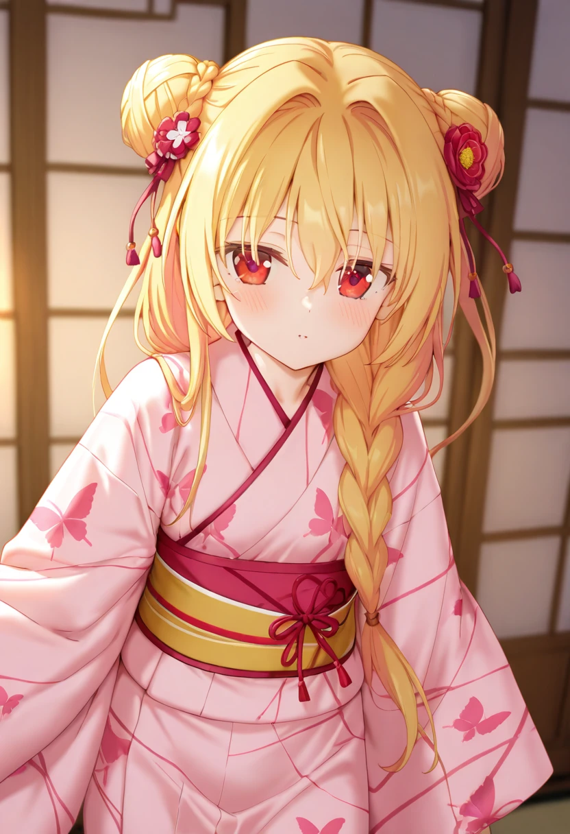 1girl,nikaidou shinku,japanese clothes,kimono,solo,blonde hair,braid,red eyes,hair bun,double bun,long hair,yukata,hair ornament,hair over shoulder,alternate hairstyle,butterfly print,hair flower,pink kimono,single braid,sash,如果你喜欢我的lora,欢迎来我的爱发电支持我,也可以定制角色/画风lora。闲鱼同名Wenaka_,多平台同名