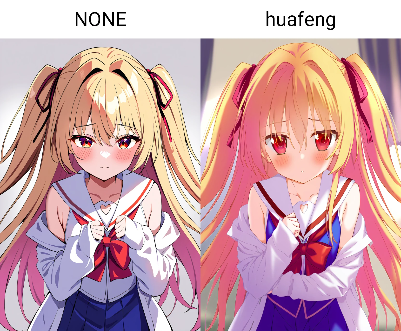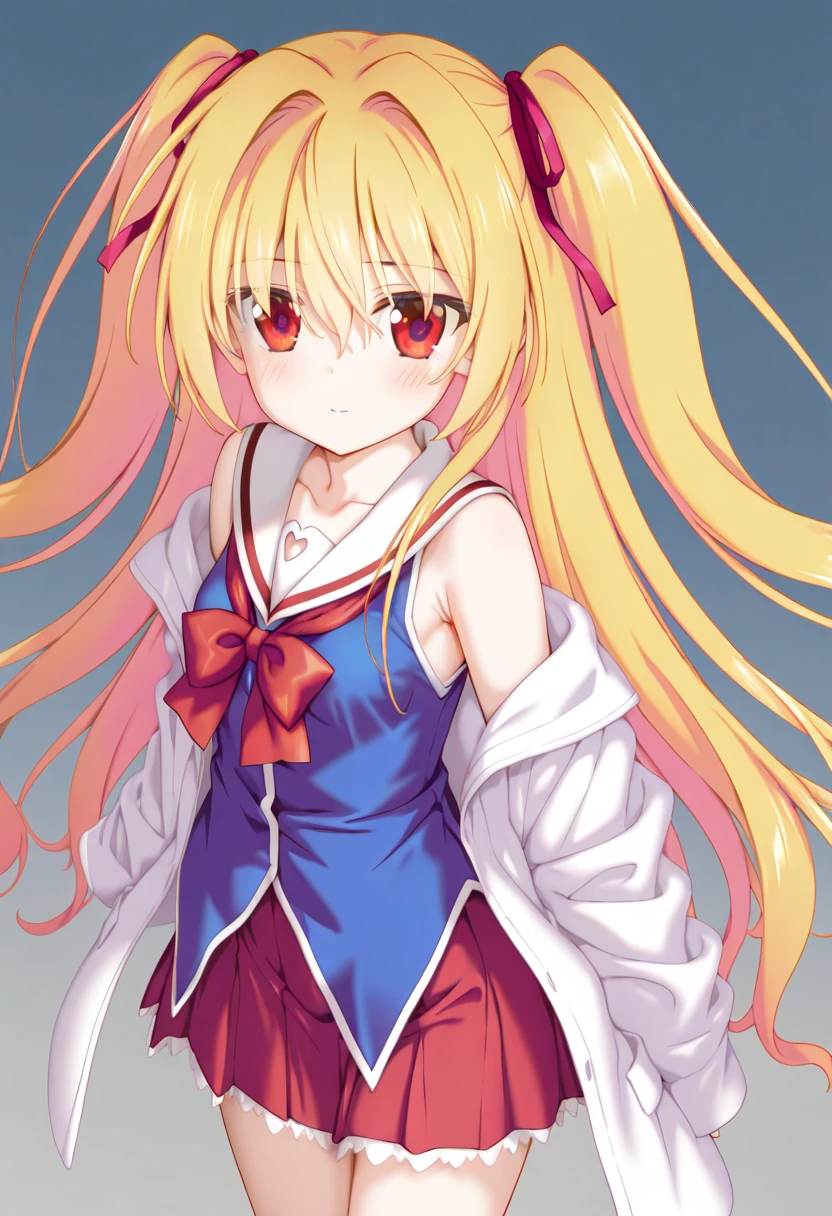 1girl,nikaidou shinku,solo,blonde hair,red eyes,school uniform,hair ribbon,two side up,skirt,hair intakes,sleeveless,very long hair,off shoulder,bow,serafuku,