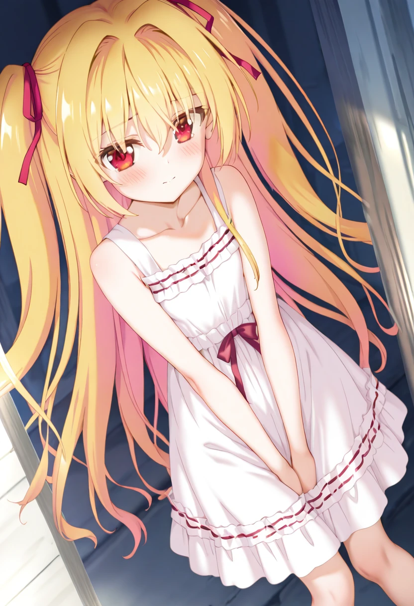 1girl,nikaidou shinku,long hair,solo,blonde hair,red eyes,dress,two side up,sundress,hair ribbon,white dress,hair intakes,sleeveless dress,collarbone,sleeveless,very long hair,
