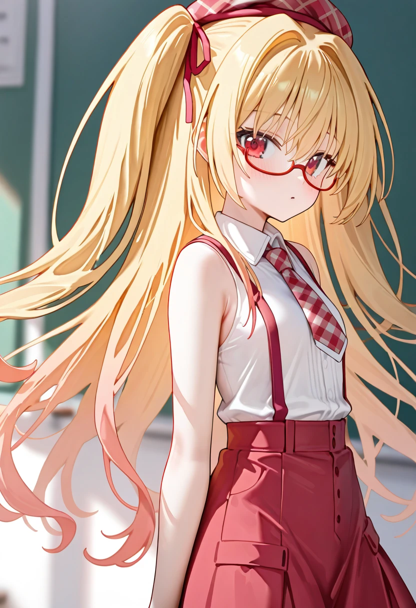 1girl,nikaidou shinku,solo,blonde hair,long hair,suspenders,glasses,red eyes,hat,two side up,hair ribbon,sleeveless,red-framed eyewear,plaid headwear,under-rim eyewear,semi-rimless eyewear,necktie,cowboy shot,