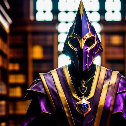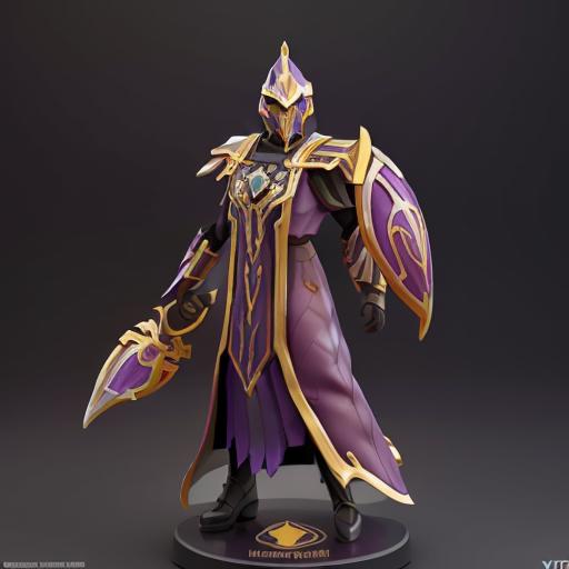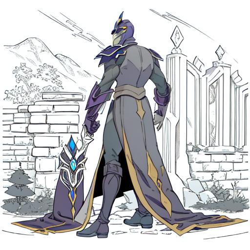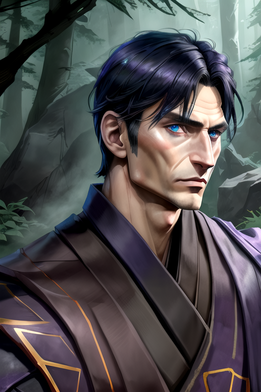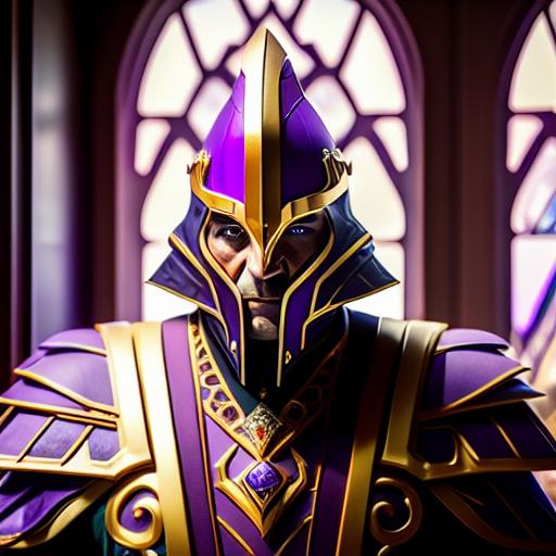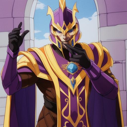 Use "NortromSilencer man" as your subject. Other tags that can help with the prompt: blue eyes, purple and gold armored robes, purple and gold shield (sorta works. His glaive and shield are very iffy)