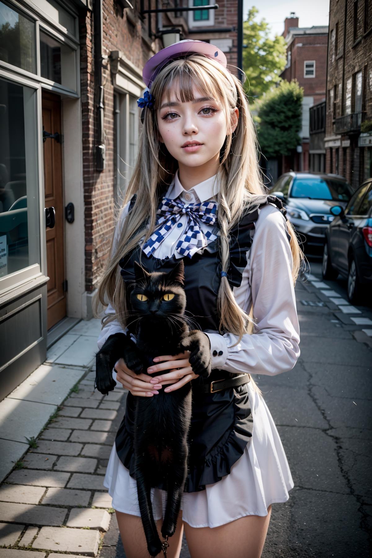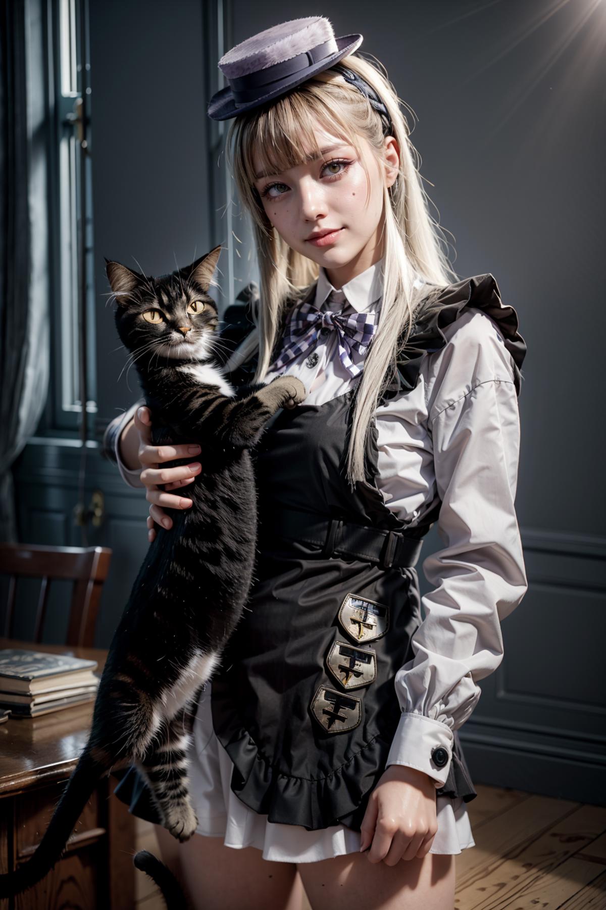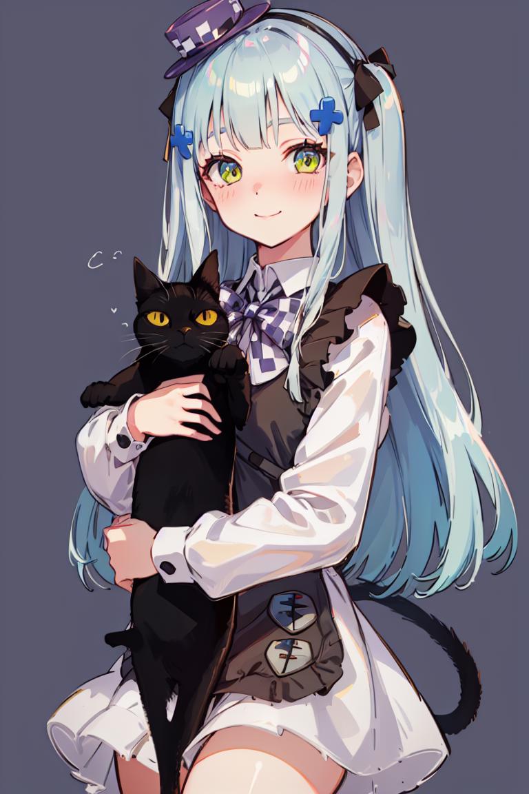 PS:You can use it as a character lora,suggest promt: blackkitty- hairstyle, outfit-blackkitty, 1girl, cat, green eyes, long hair, grey hair, mini hat, holding animal, holding cat, hair ornament, bangs, looking at viewer, simple background, solo, smile, holding, blush