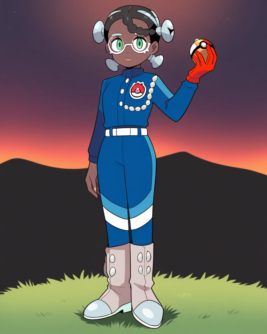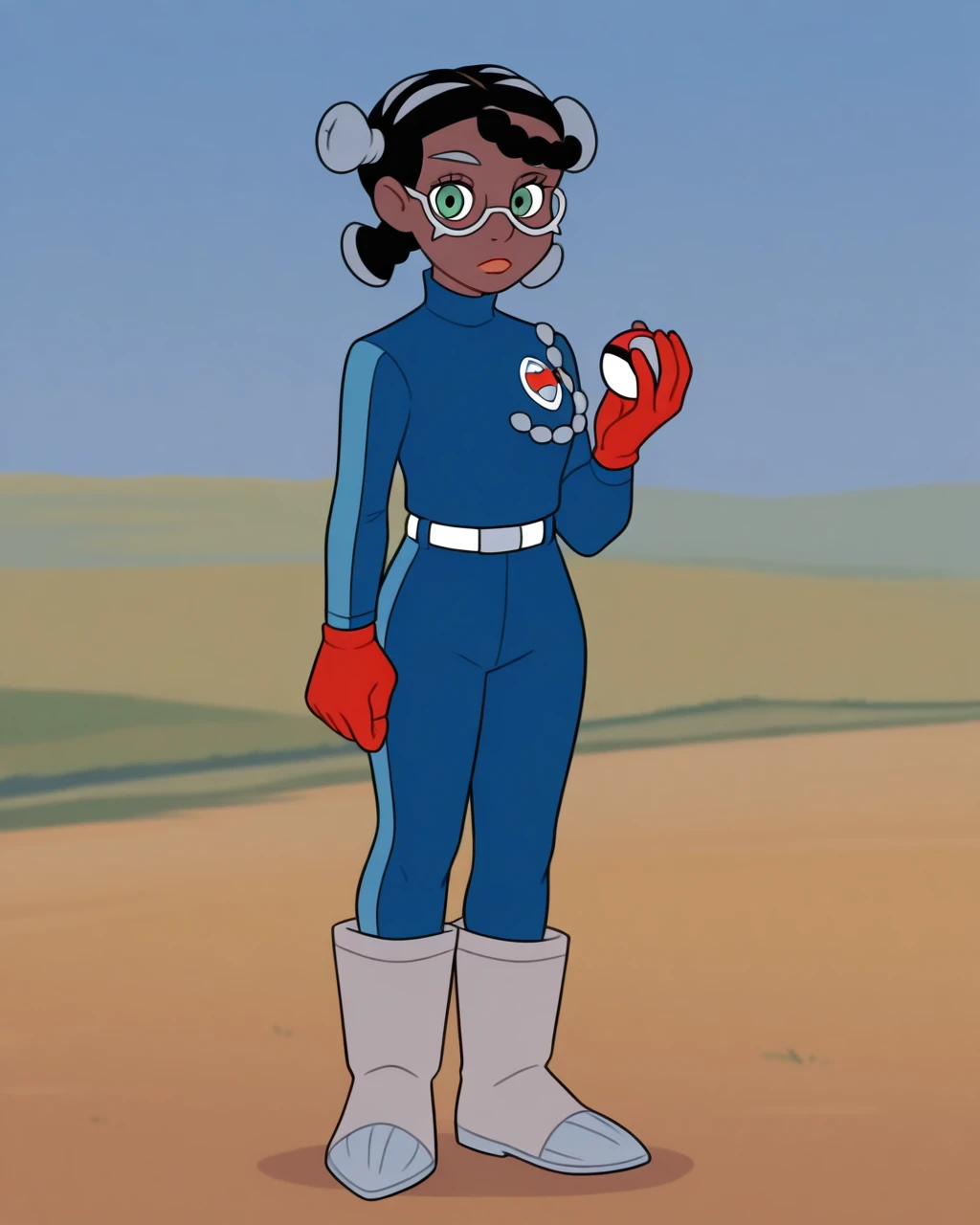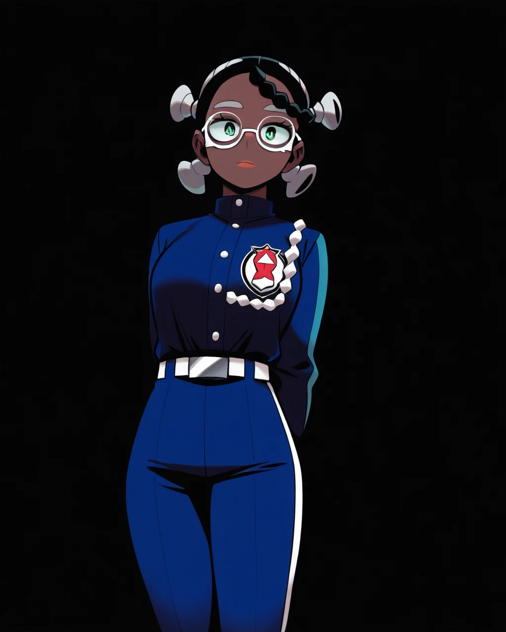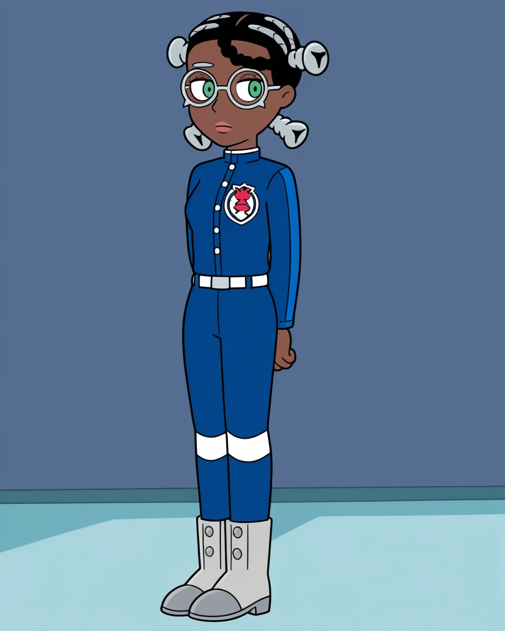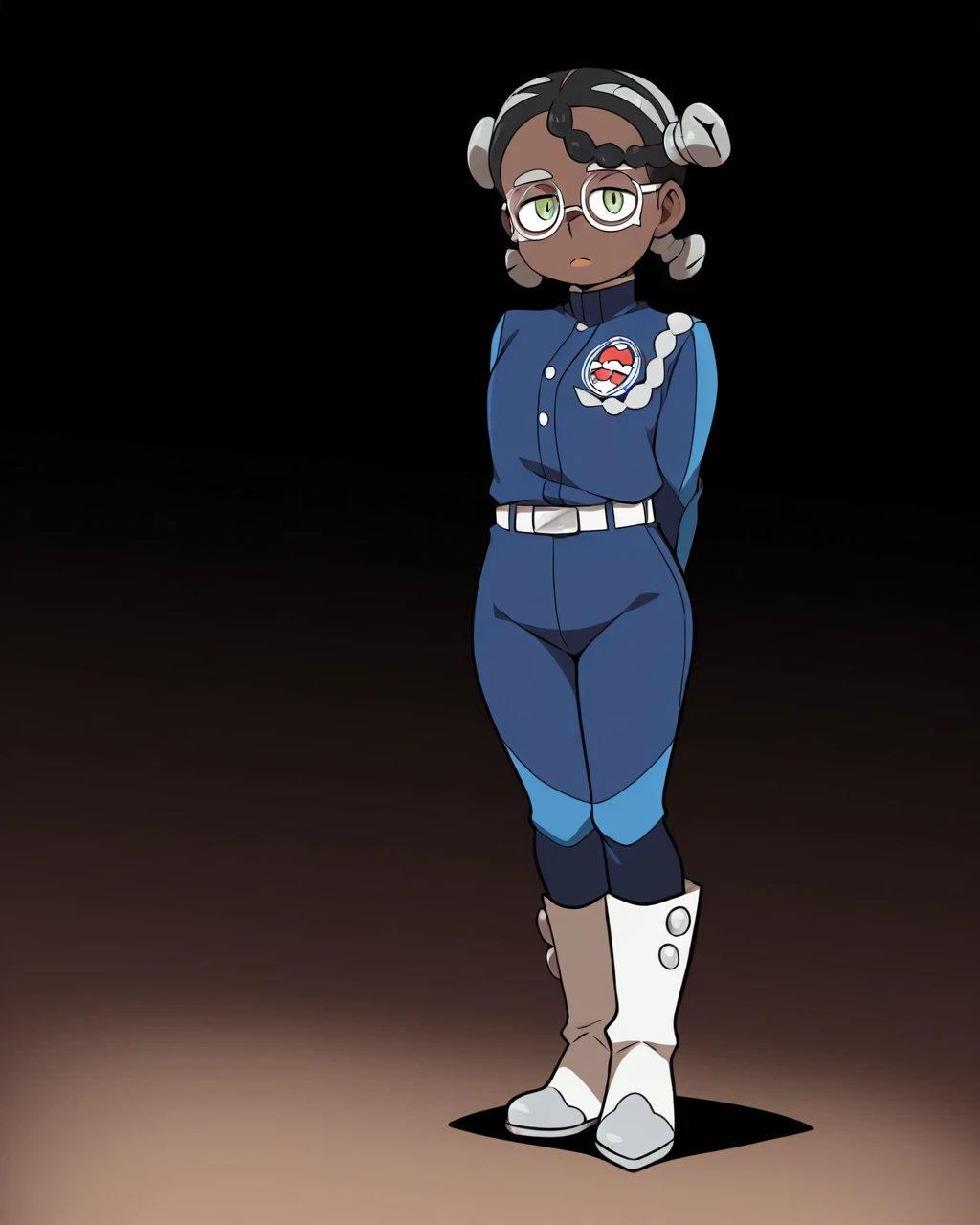 dark skin, dark-skinned female, thick eyebrows, glasses, green eyes, black hair, braid, blue shirt, long sleeves, blue pants, white belt, white boots