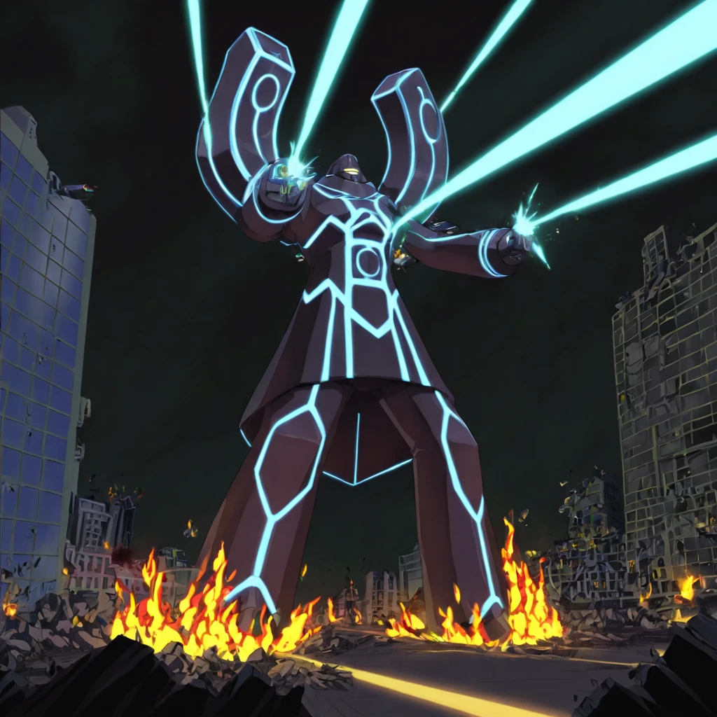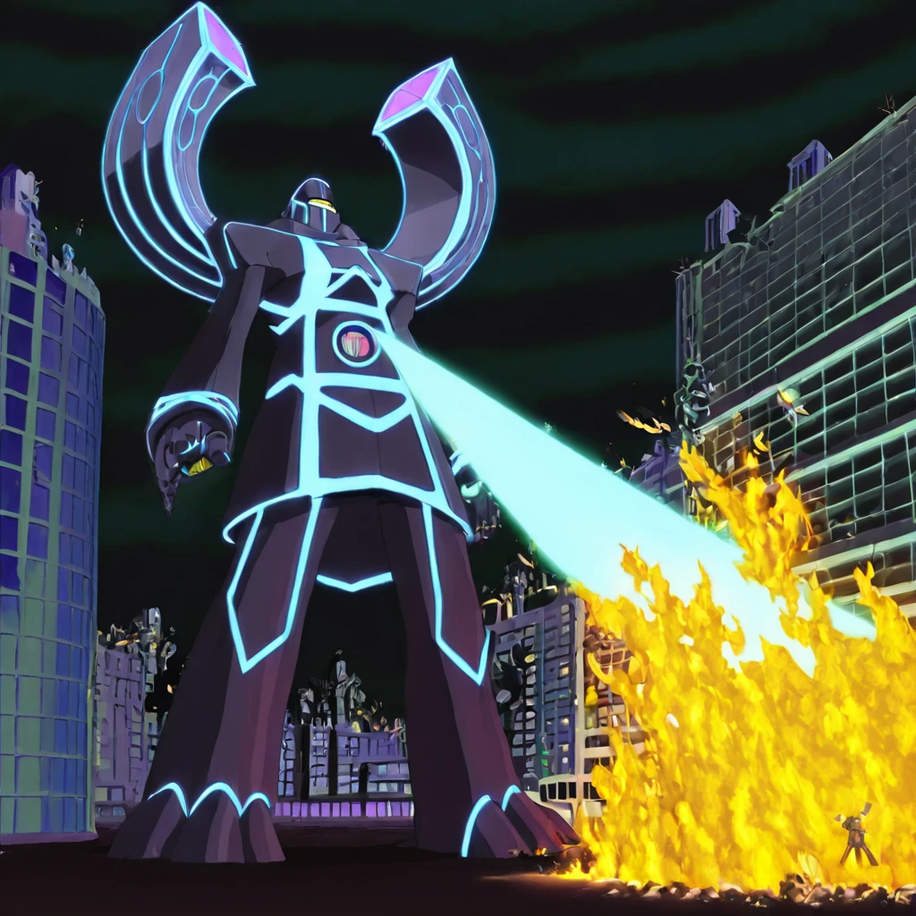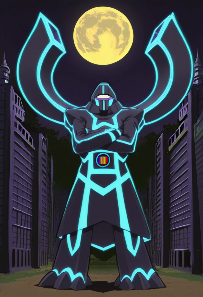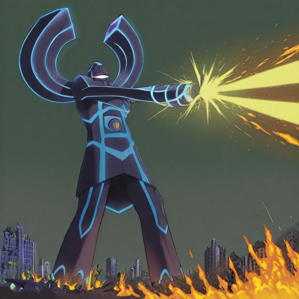 Laserman, NetNavi, Solo, Shoulder Cannon, One-Eyed, Yellow Eyes, Purple Eyeliner, Neon Trim, Coat, Black Coat, Emblem, Anime Screenshot