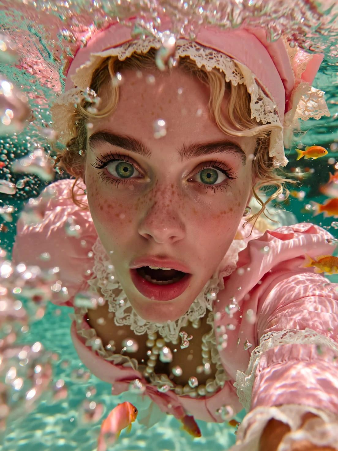 此模型擅長創造獨特的「水下自拍」時刻。它利用廣角鏡頭,捕捉主體在清澈水波中直面鏡頭的驚訝瞬間,表情誇張而生動。畫面充滿動感氣泡,光影在水下折射出夢幻效果。整體風格色彩鮮豔,細節豐富,能將任何角色置於這場超現實的水下奇遇中,生成兼具趣味性與超高畫質的奇幻影像。