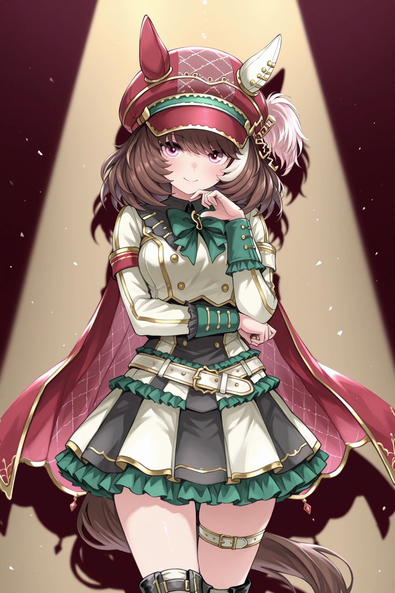 horse girl,horse ears,horse tail,brown hair,short hair,long hair,hair between eyes,red hat,ear covers,mismatched animal ear colors,pink eyes,