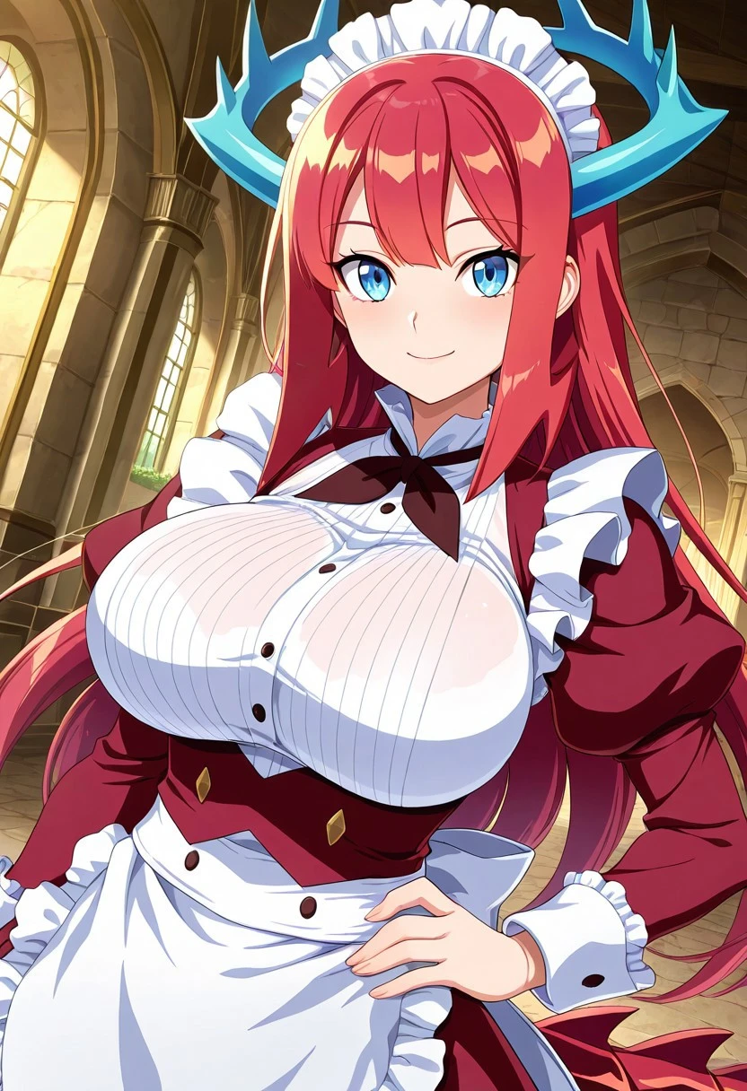 Tylulu, red hair, long_hair, blue_eyes, red dragon tail,blue horns, huge_breasts,