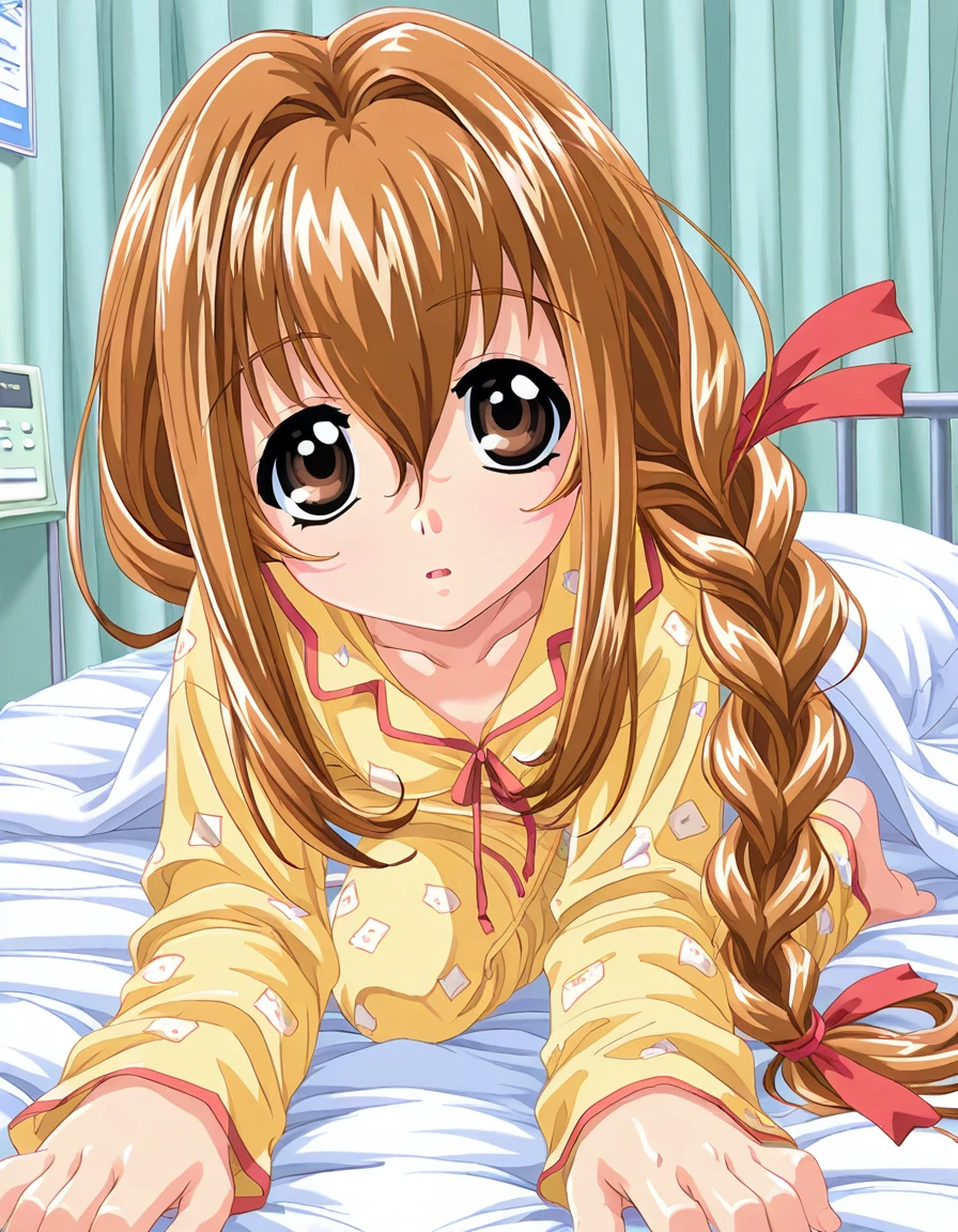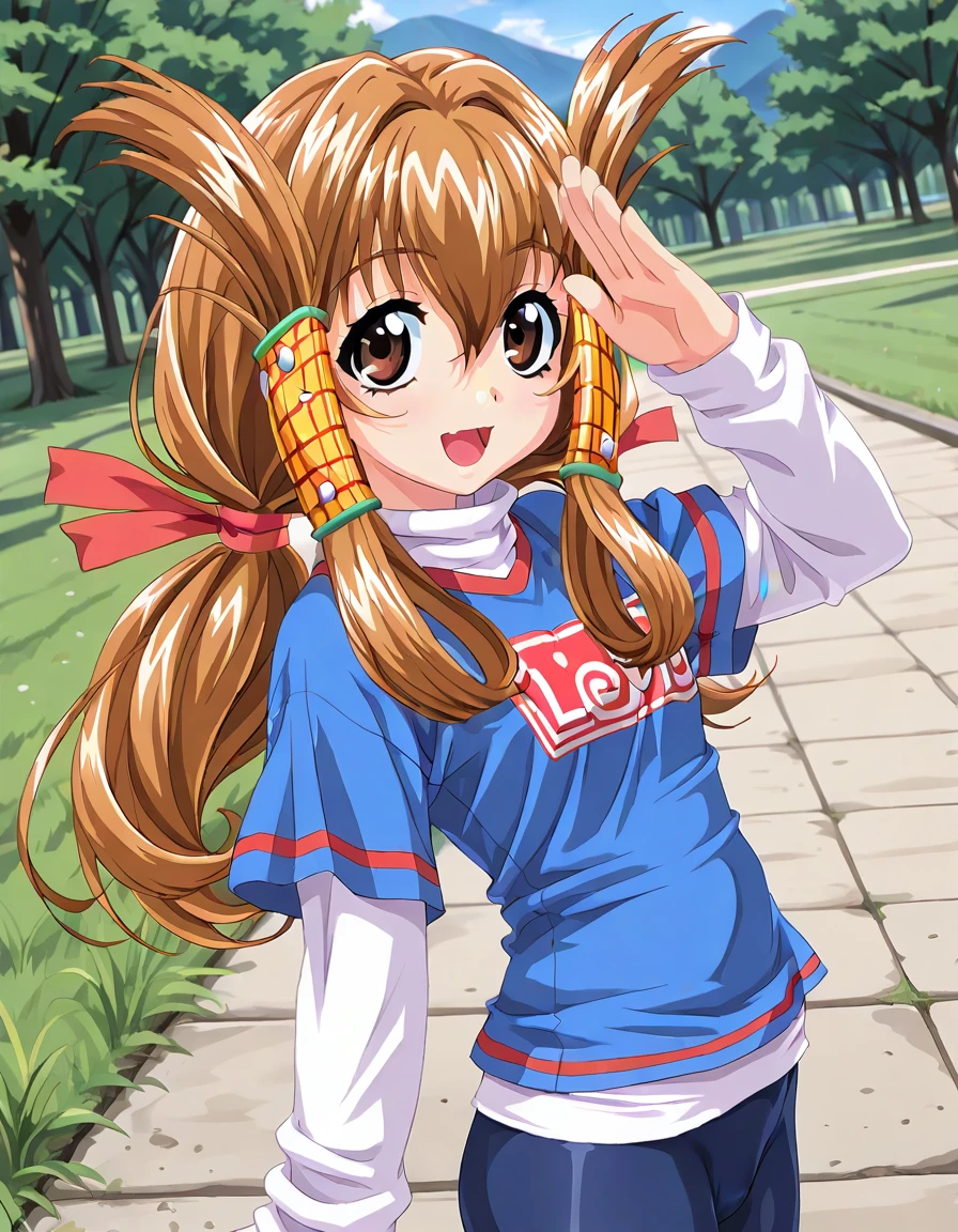 kashiwagi aya, folded sidelocks, hair tubes, hair ribbon, short over long sleevs, turtleneck, blue shirt, white shirt, bike shorts, retro artstyle