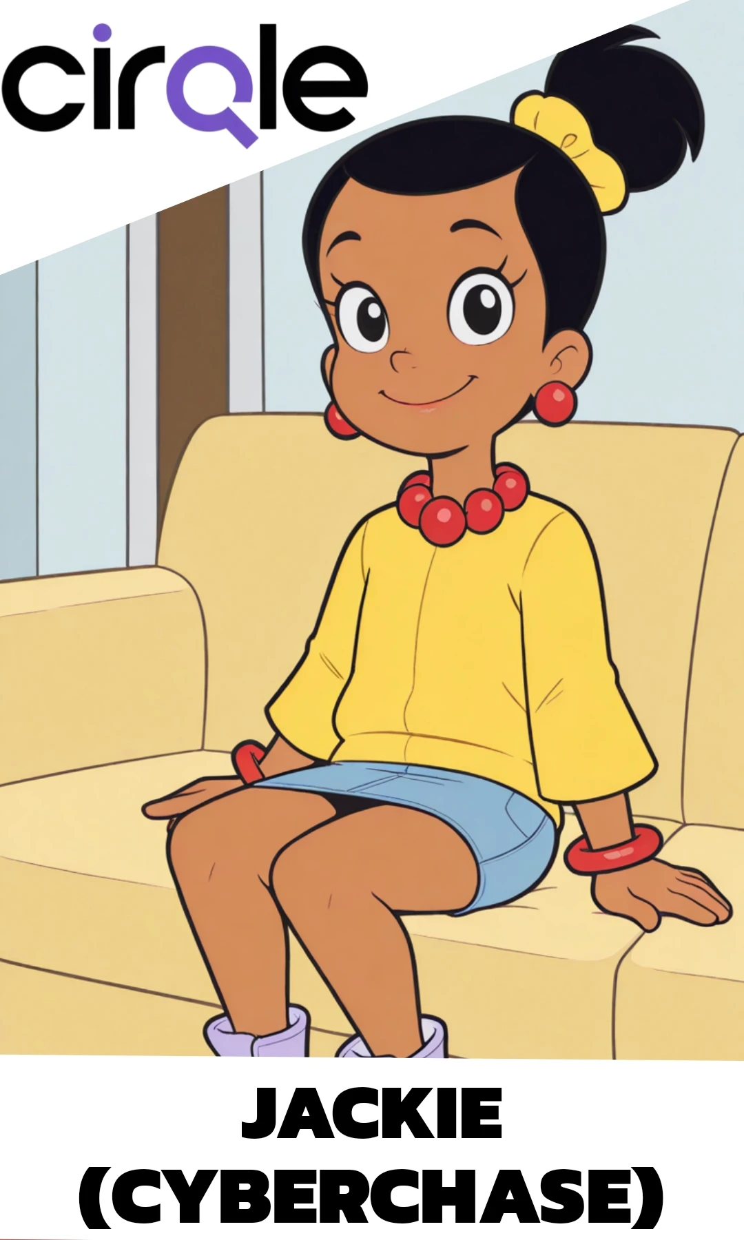 Jackie,black eyes,black hair,yellow scrunchie,yellow long-sleeved sweater,light blue denim skirt,red bangle bracelet,light purple-white high tops,red pearl necklace,red earrings