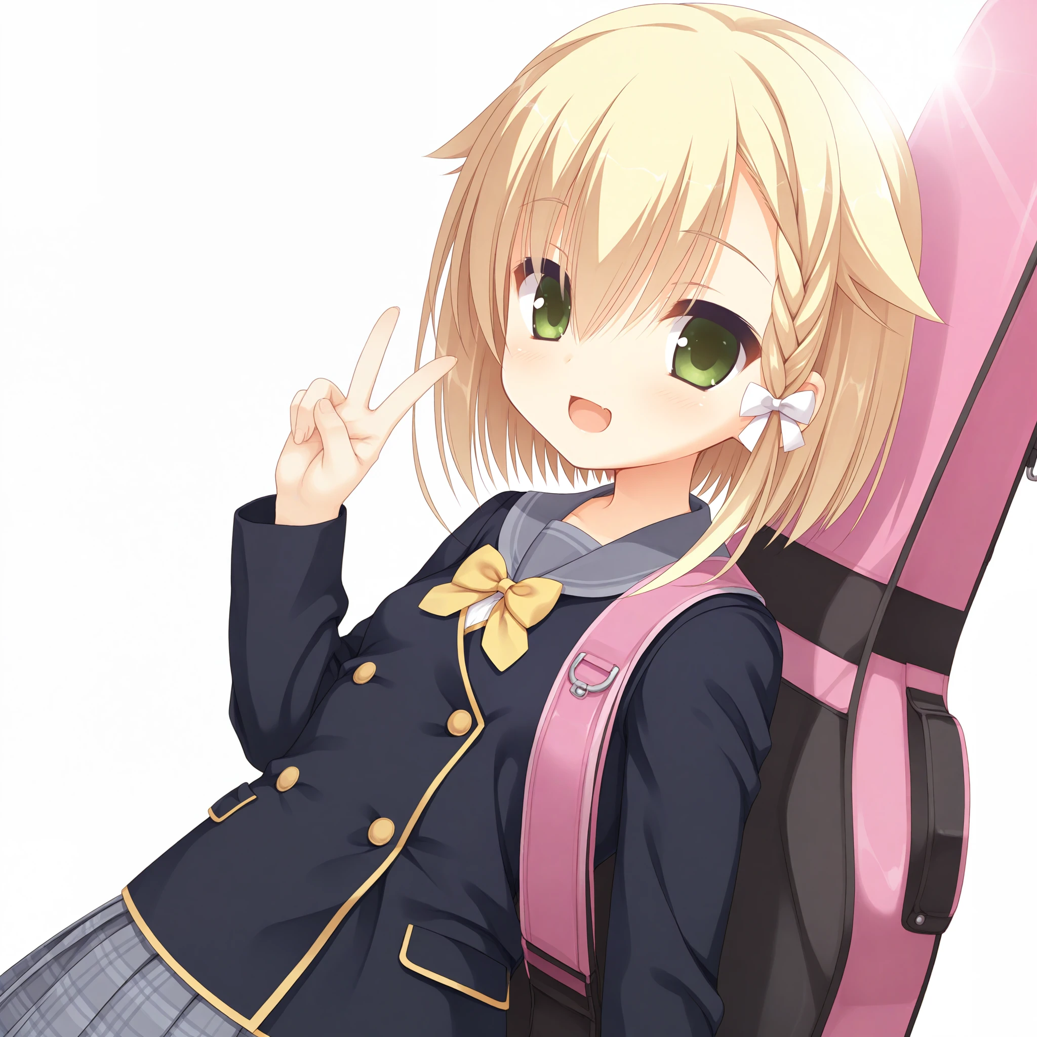 single braid,side braid,hair ribbon,white ribbon,school uniform,grey skirt,pleated skirt,grey sailor collar,miniskirt,yellow bowtie,black jacket,plaid skirt,long sleeves,serafuku,double-breasted,collared jacket,夹克 (jacket)