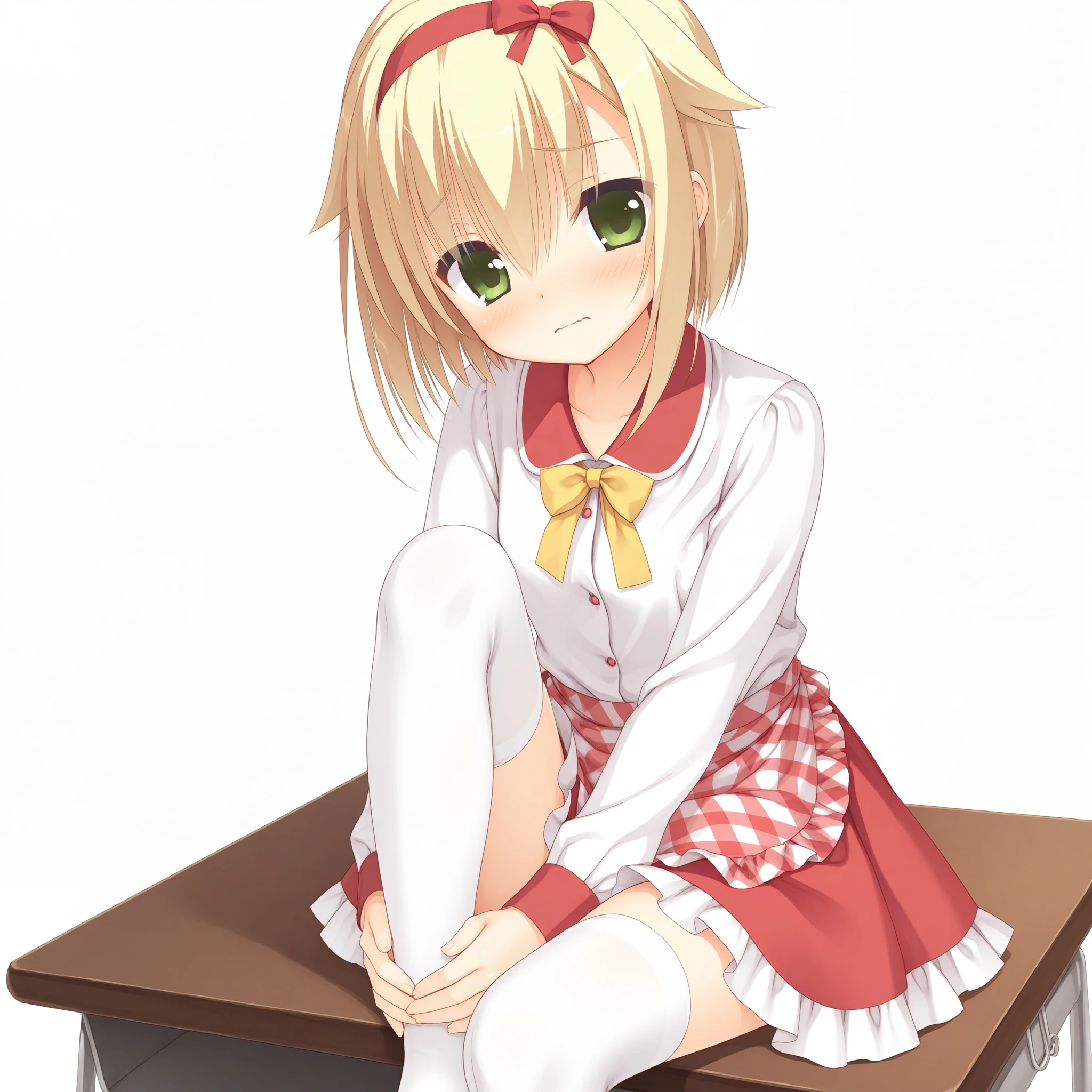 red hairband,bow hairband,red bow,waitress,white thighhighs,frilled skirt,white shirt,red skirt,long sleeves,yellow bowtie,miniskirt,frilled apron,waist apron,collared shirt,buttons,red sleeve cuffs,white frills,red collar,plaid apron,red apron,white apron,————————————
