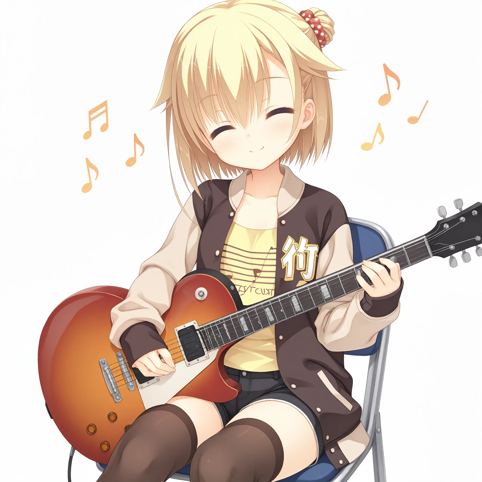 hair scrunchie,single hair bun,braided bun,red scrunchie,polka dot scrunchie,brown jacket,yellow shirt,open jacket,clothes writing,short shorts,black shorts,long sleeves,letterman jacket,sleeves past wrists,two-tone jacket,brown sleeve cuffs,print shirt,brown thighhighs,服务员 (waitress)
