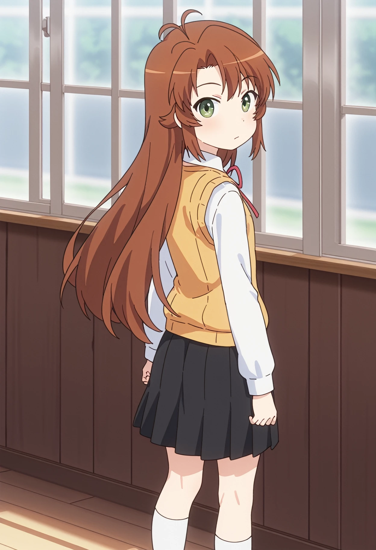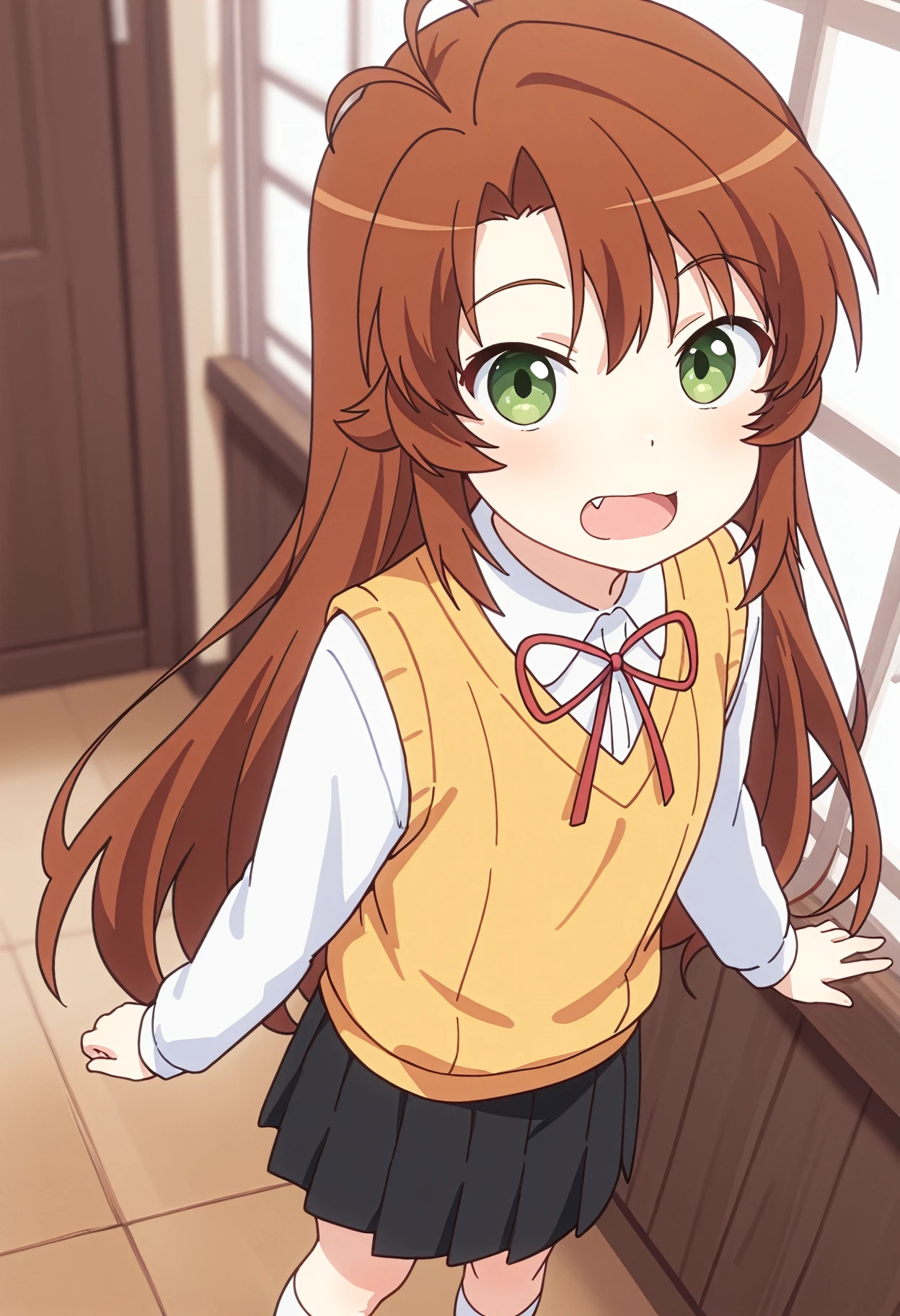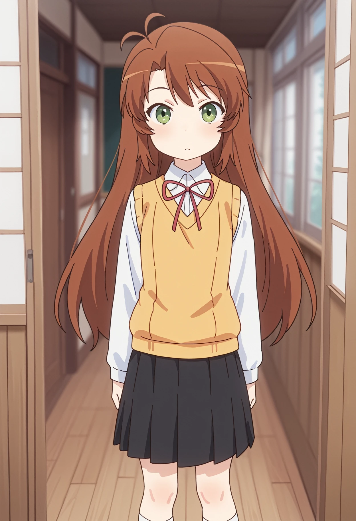 koshigaya komari, long hair, school uniform, brown hair, sweater vest, antenna hair, green eyes, long sleeves, neck ribbon, shirt, skirt, kneehighs