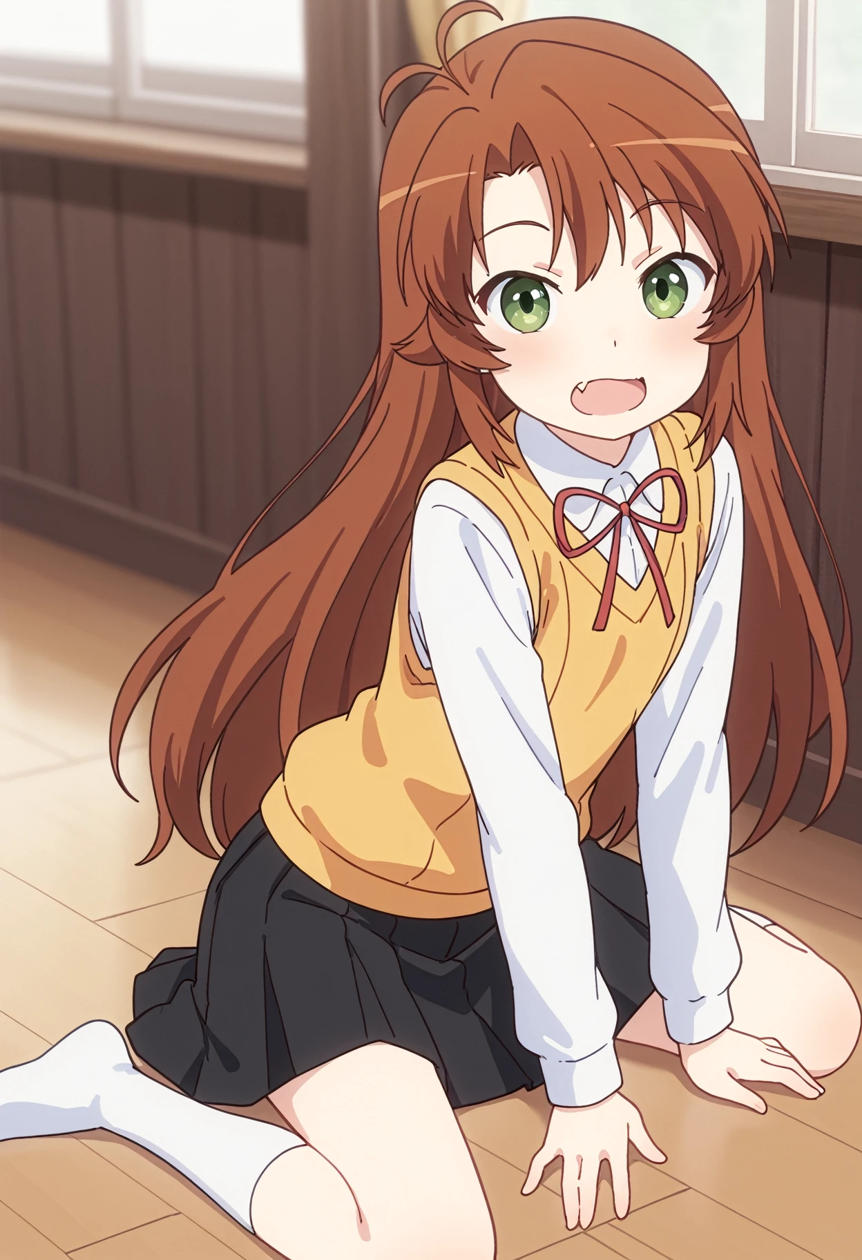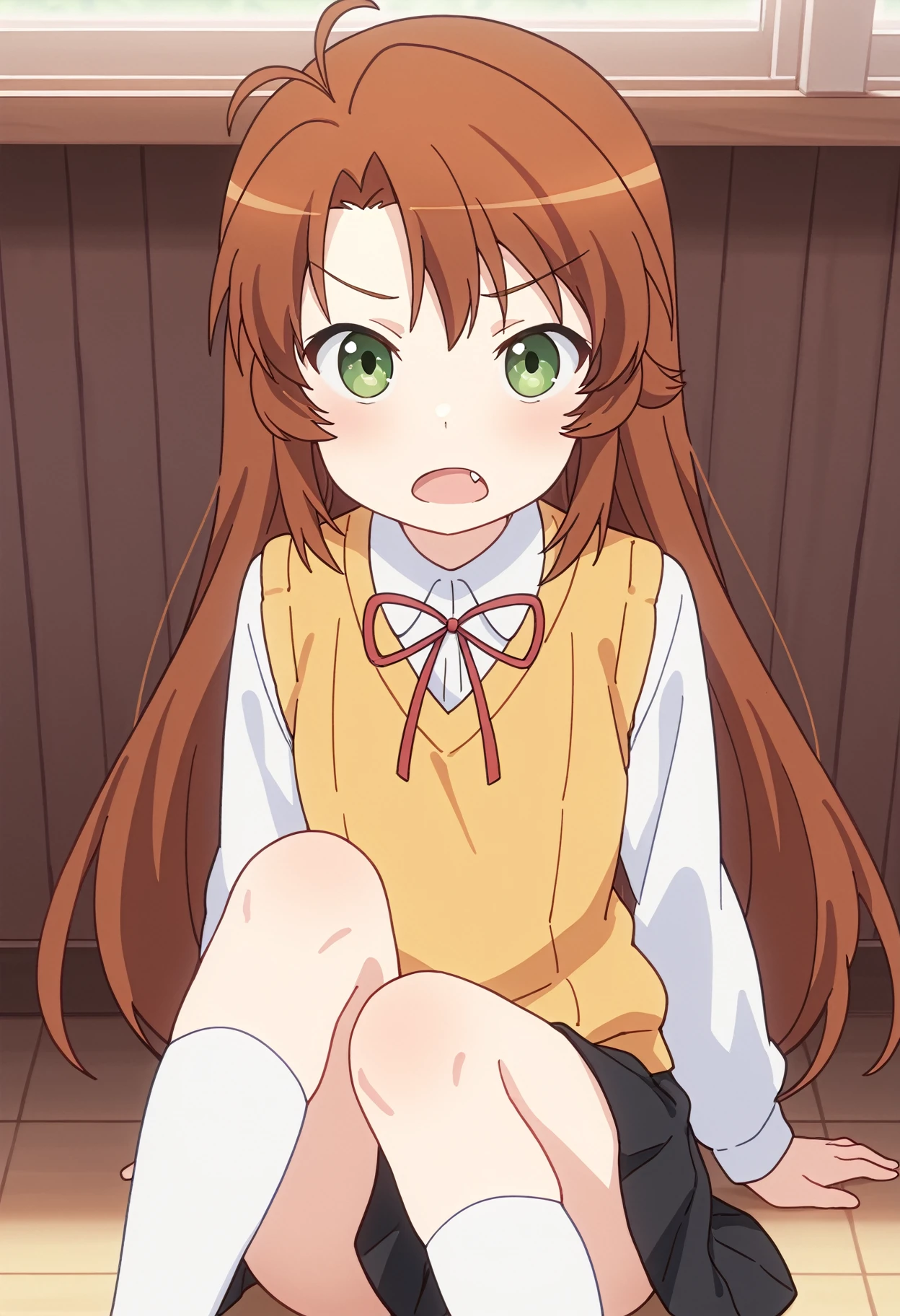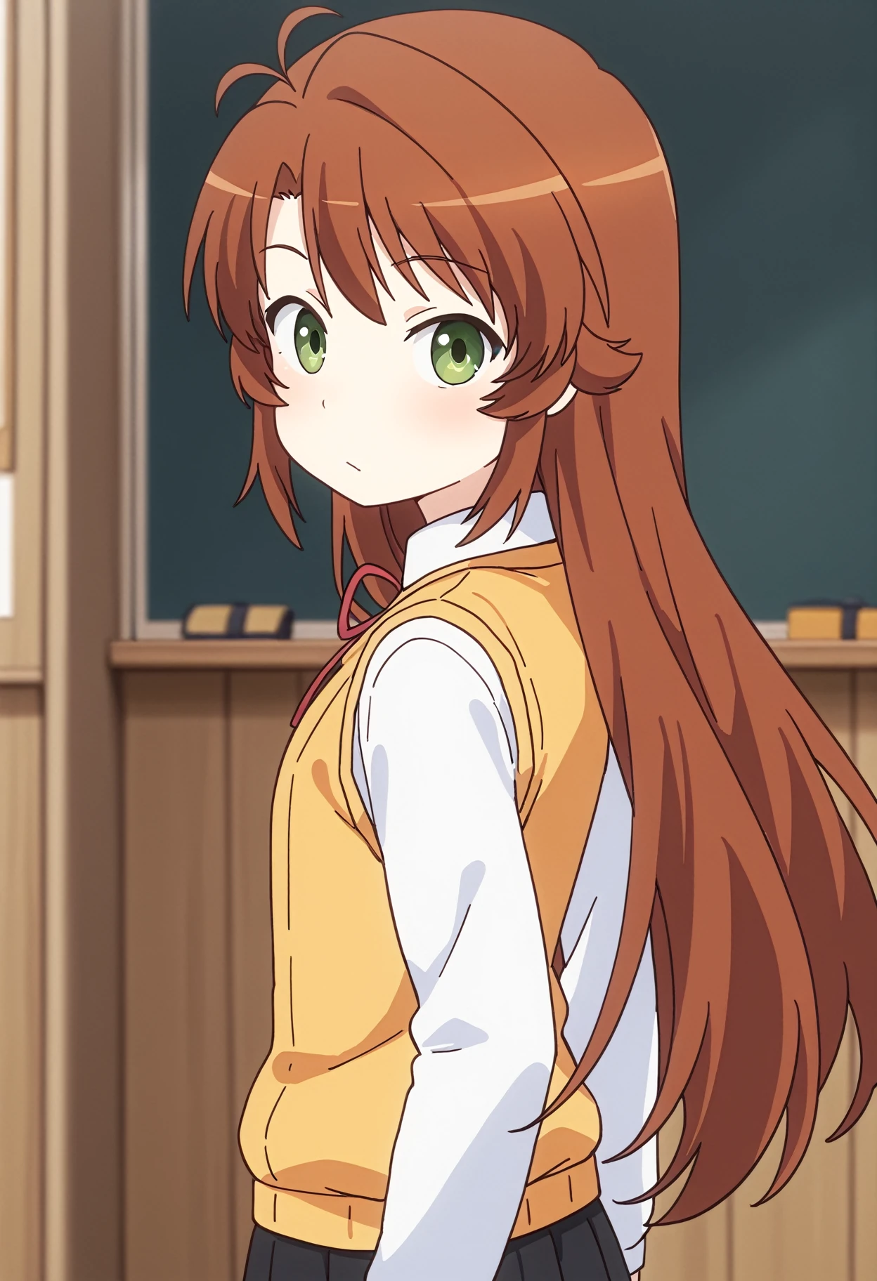 koshigaya komari, long hair, school uniform, brown hair, sweater vest, antenna hair, green eyes, long sleeves, neck ribbon, shirt, skirt, kneehighs
