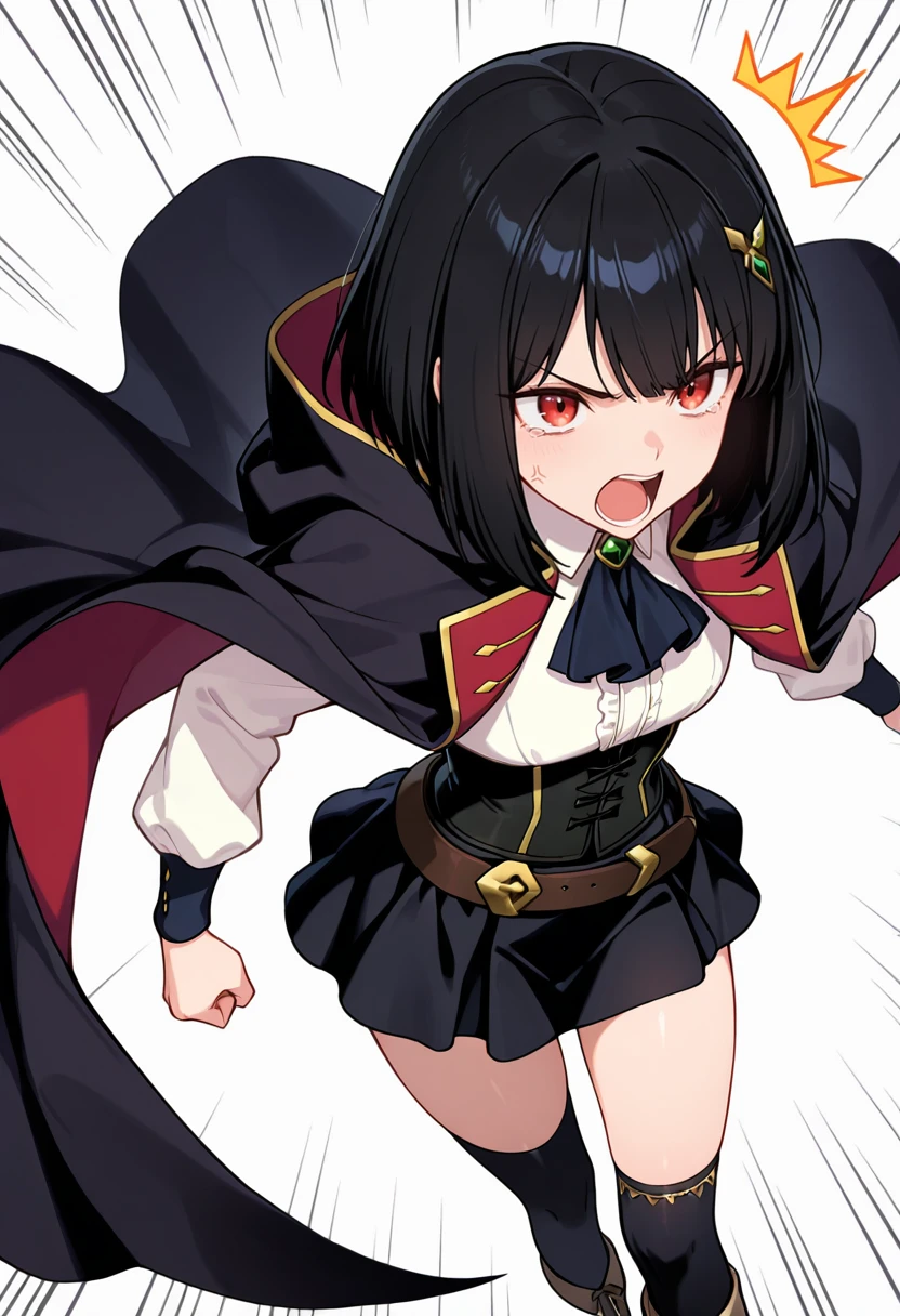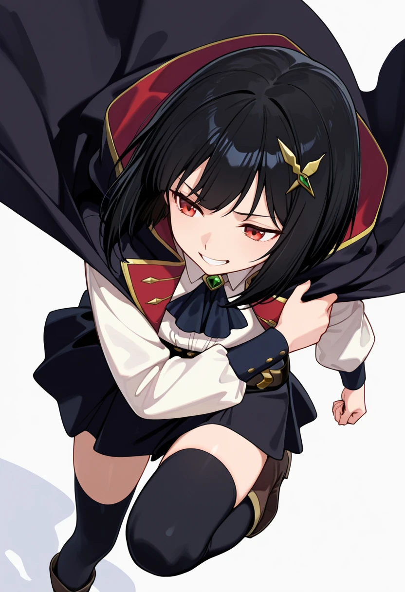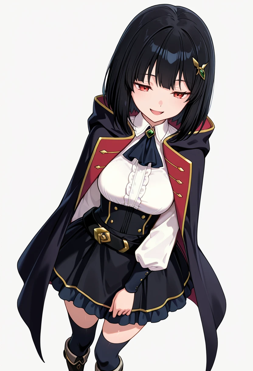 ascot,white shirt,skirt, cloak, long sleeves, thighhighs, black skirt,brooch,belt,Explanation and notes below👇
