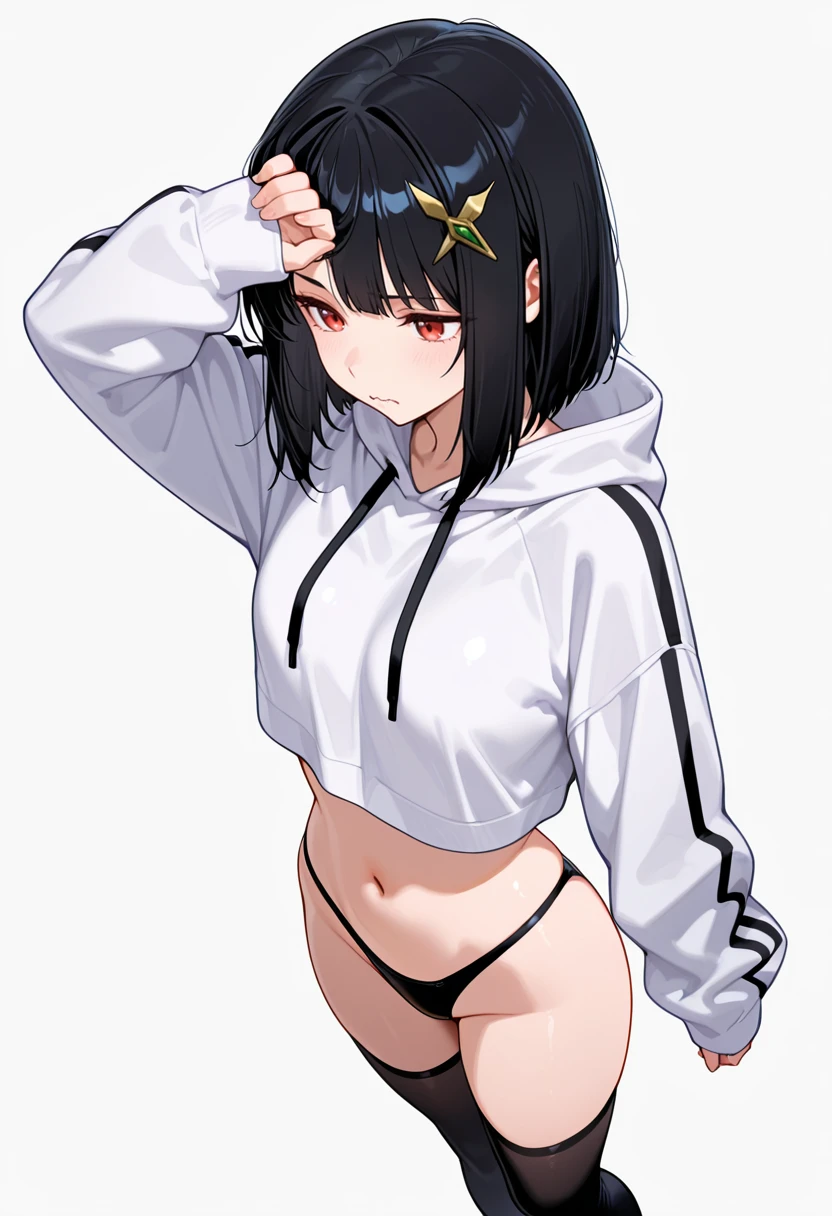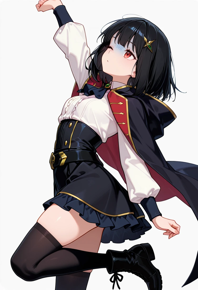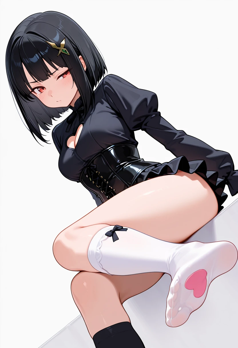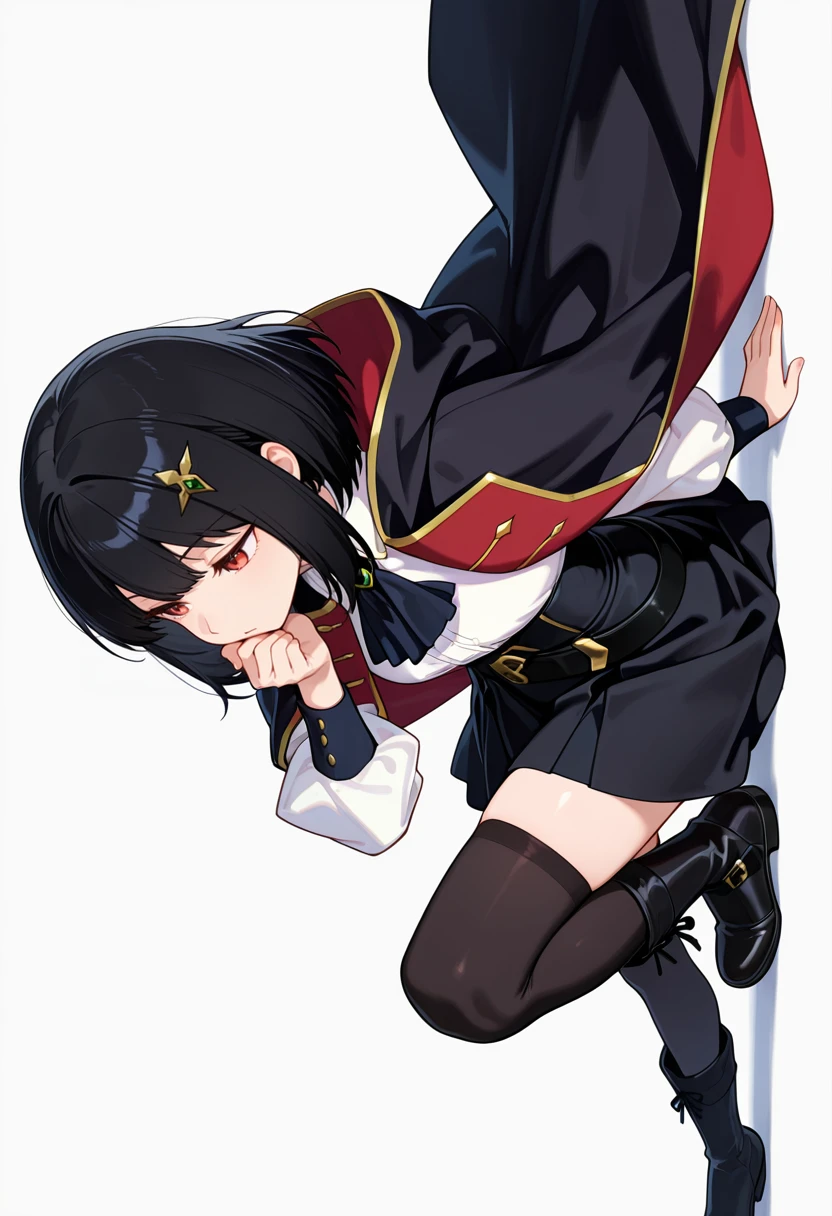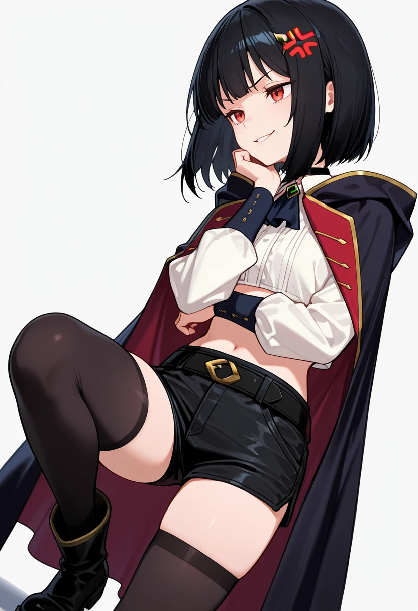 harbeller_cnr, 1girl, black hair, red eyes, short hair, medium hair, bob cut,hair ornament,👗Default Outfit