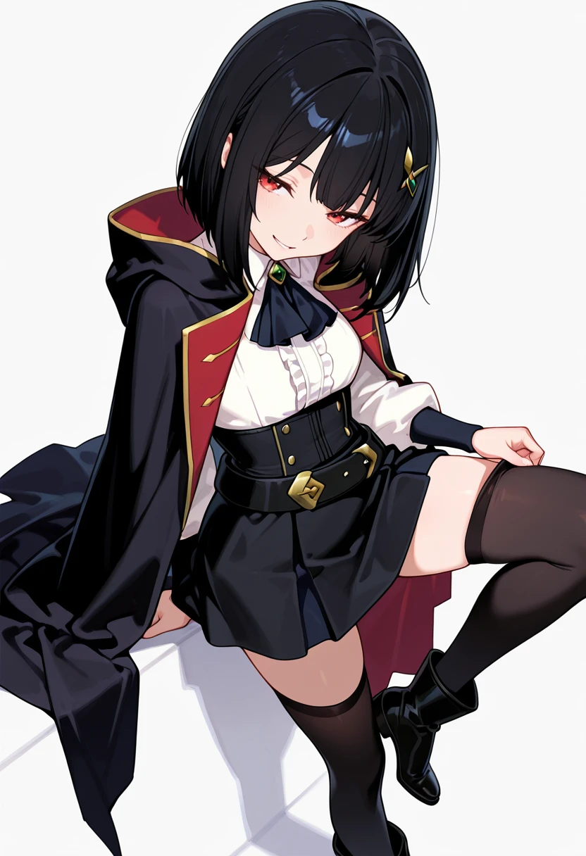 ascot,white shirt,skirt, cloak, long sleeves, thighhighs, black skirt,brooch,belt,Details
