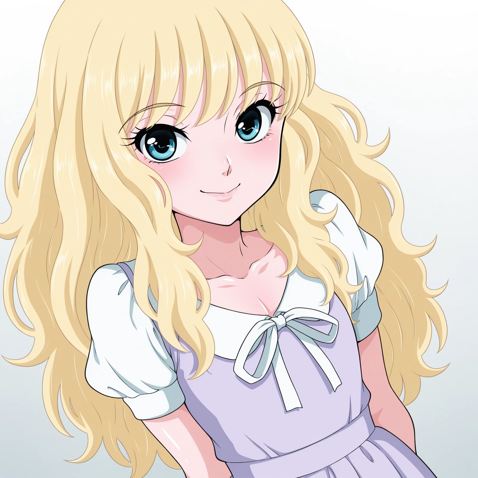 dozamura style, rouge, blonde hair, long hair, blue eyes, dress